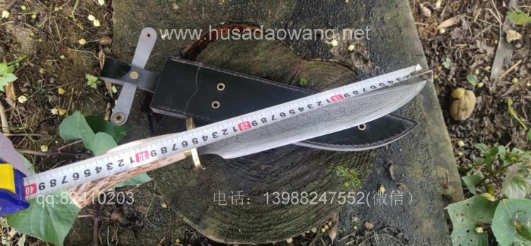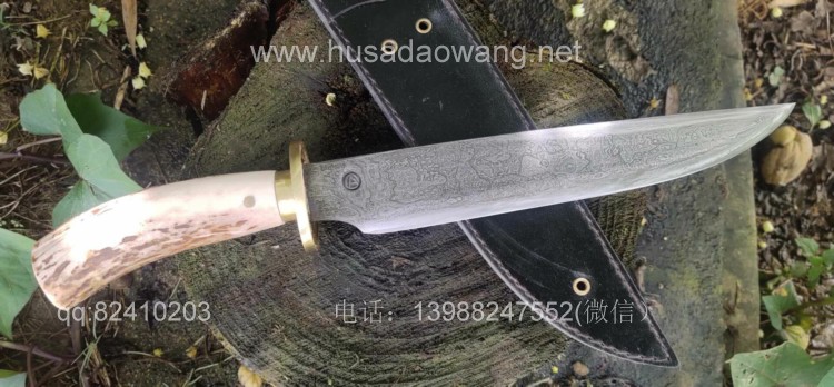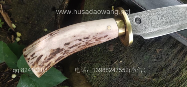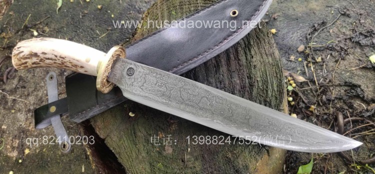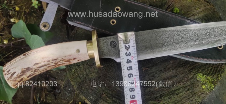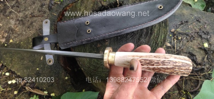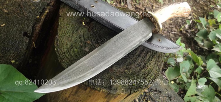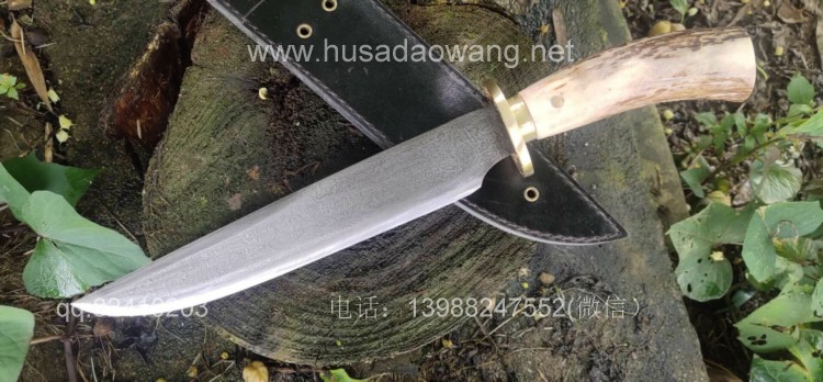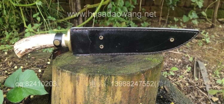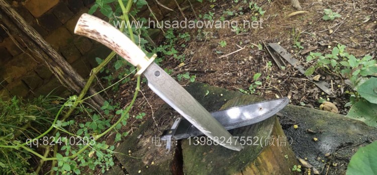 商品名称:户撒刀王(阿昌刀)百炼钢手锻鹿角博依刀 商品规格:刃长25厘米左右 全长37厘米左右 厚度7毫米左右 商品简介:此刀由户撒刀名匠杨茂方纯手工锻打的野生鹿角大博依刀,刀条精选优等 百炼花纹钢采用户撒传统锻打工艺千锤百炼而成,刀条形状流畅精美,刃口锋利坚硬 ,粗锋砍铁不伤,细锋可以轻松刮毛,刀条穿刺能力和劈砍能力都十分突出,刀柄采 用真正野生鹿角手工制作,手感非常好!这把刀户外和收藏都是非常好的选择,大家 抓紧时间定制!