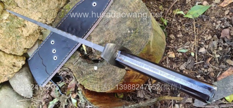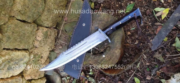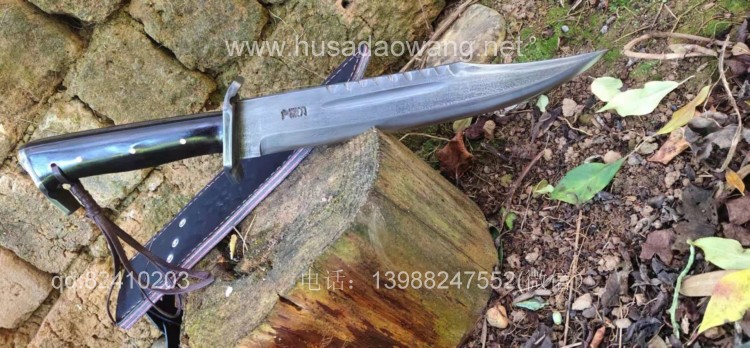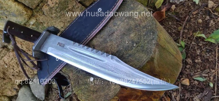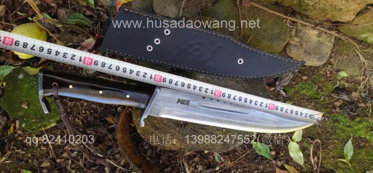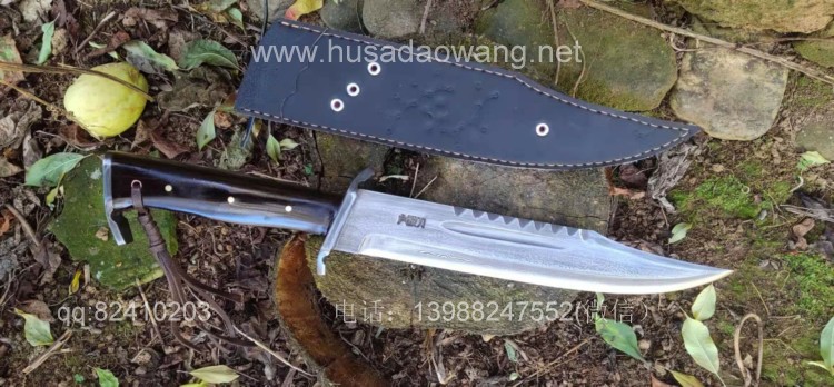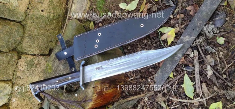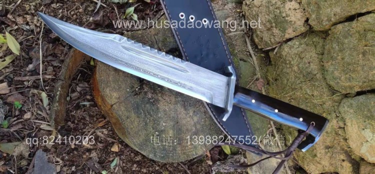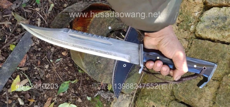 商品名称:户撒刀王(阿昌刀)百炼花纹钢大博依刀 商品规格:刃长30厘米左右 全长45厘米做 厚度6毫米左右 商品简介:此刀为户撒优秀刀匠精选百炼花纹钢纯手工锻打而成,刀条经过匠人千锤百炼手工锻打后配方淬火刃口坚硬锋利,刚柔相济,粗锋轻松砍断铁钉,细锋可以锋利刮毛!此刀造型彪悍线条硬朗,一体全龙骨结构结实耐用,手感也非常舒适,劈砍穿刺俱佳,护手和尾钢也为纯手工制作,工序复杂简洁实用!此刀配便携牛皮刀鞘,为户外佳品!