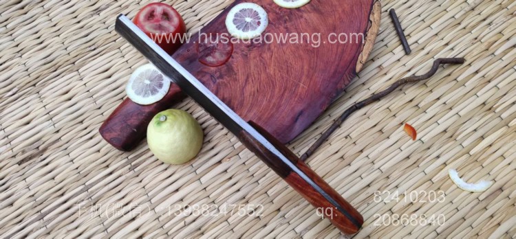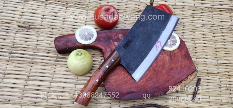 商品简介:此砍骨刀(斩骨刀)刀为精选进口车弹簧(非普通弹簧钢)户撒传统锻造工艺反复锻打而成,刃口局部淬火,以达到刚柔相济作用,刃口采用人工冷磨以防刃口退火!并且采用不同目数的磨石依次打磨,根据刀具不同的应用要求进行刃口处理,使用更加得心应手!刀柄采用上等缅甸红酸枝手工制作,手感舒适耐用!此款砍骨刀(斩骨刀)刃长19-20厘米 宽度10厘米左右(全手工锻打数据会稍有变化)左右,刀表面保持锻打痕迹体现煅烧黑效果,此刀符合大部分家庭用户使用习惯和需求,达到轻松砍大骨头不伤刃口,再实际测试性能时砍钢筋也不在话下,性能非常强悍!拥有了它们让您感觉家庭做饭也充满了阳刚之气!