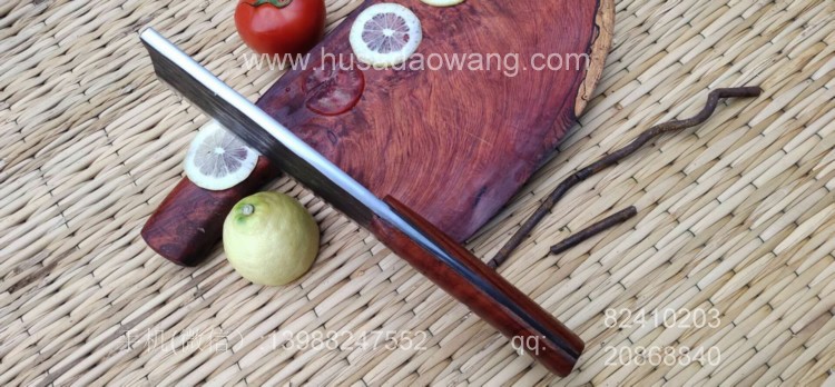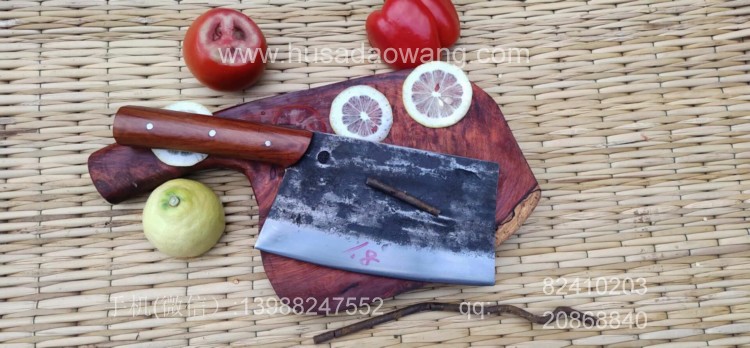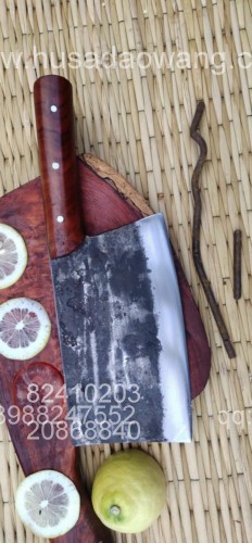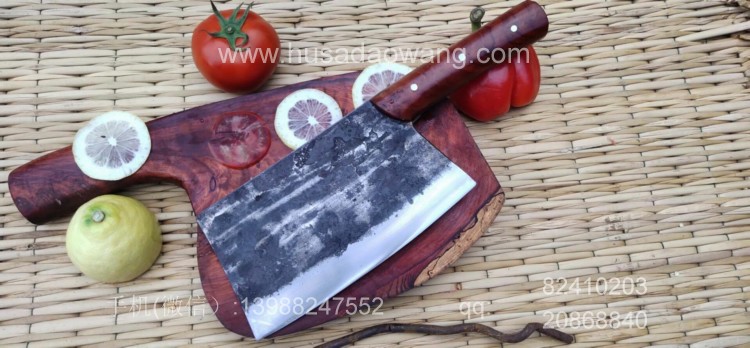 商品简介:此砍骨刀(斩骨刀)刀为精选进口车弹簧(非普通弹簧钢)户撒传统锻造工艺反复锻打而成,刃口局部淬火,以达到刚柔相济作用,刃口采用人工冷磨以防刃口退火!并且采用不同目数的磨石依次打磨,根据刀具不同的应用要求进行刃口处理,使用更加得心应手!刀柄采用上等缅甸红酸枝手工制作,手感舒适耐用!此款砍骨刀(斩骨刀)刃长19-20厘米 宽度10厘米左右(全手工锻打数据会稍有变化)左右,刀表面保持锻打痕迹体现古朴的沧桑效果,此刀符合大部分家庭用户使用习惯和需求,达到轻松砍大骨头不伤刃口,再实际测试性能时砍钢筋也不在话下,性能非常强悍!拥有了它们让您感觉家庭做饭也充满了阳刚之气!