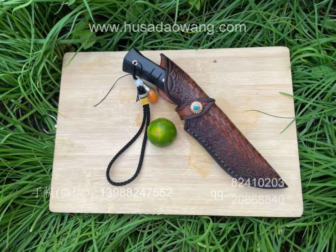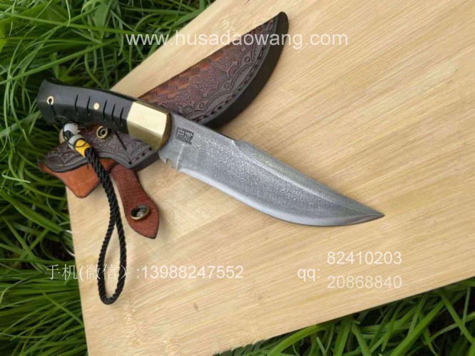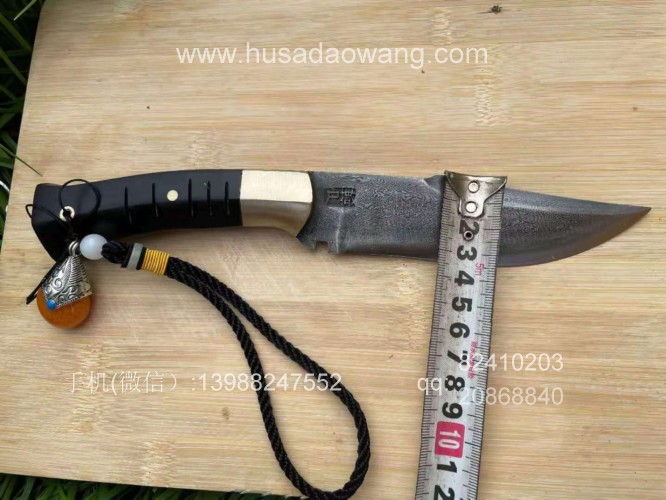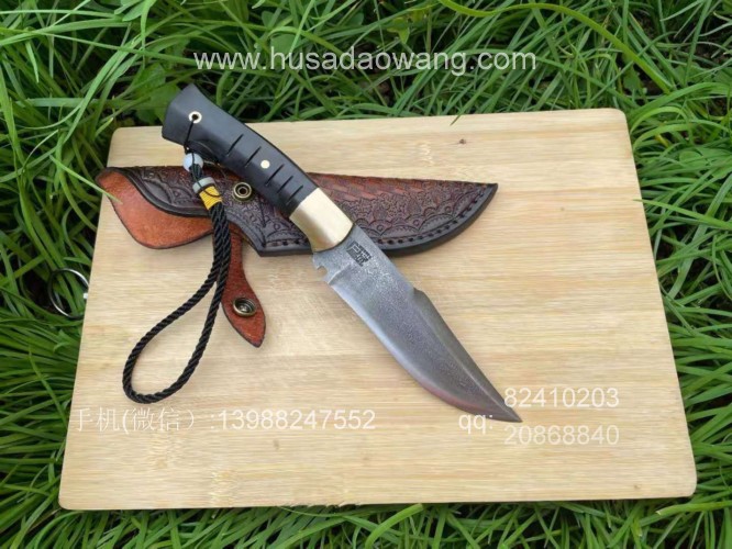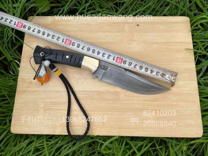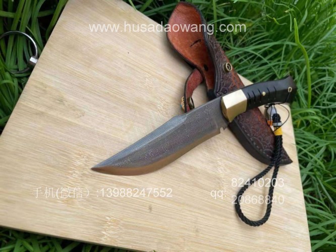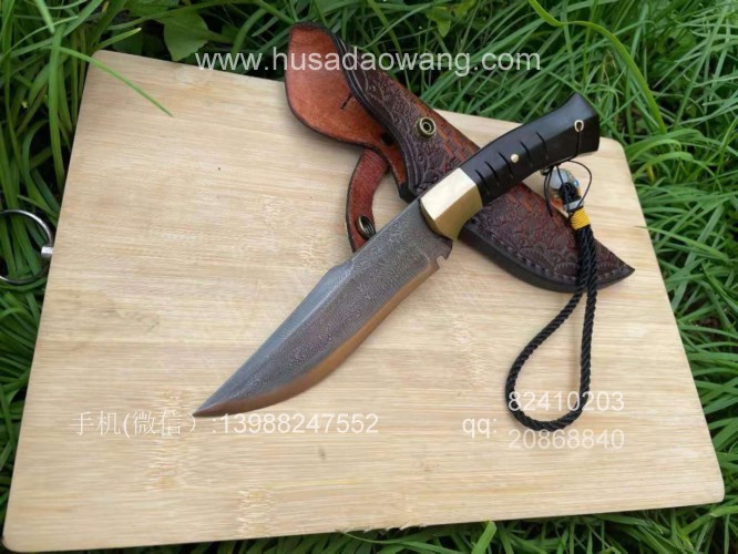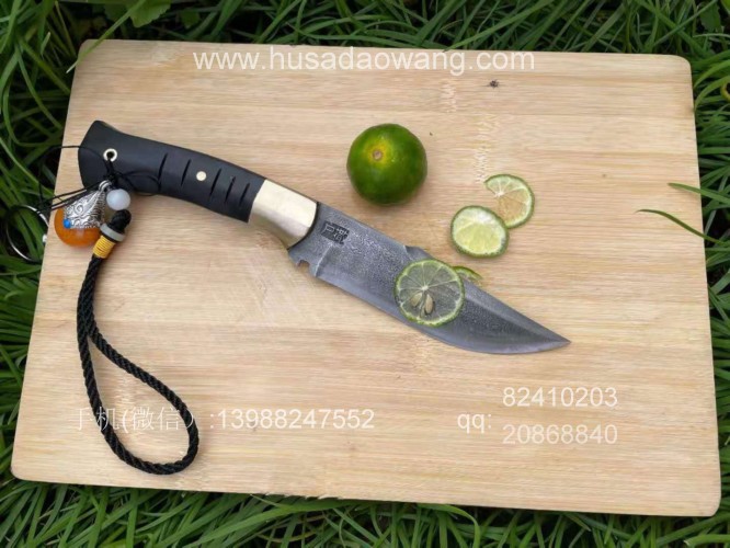 商品名称:户撒刀王(阿昌刀)花纹钢铜隔片森林猎刀 商品规格:刃长13厘米左右 全长25厘米左右 厚度6毫米左右 商品简介:此便携猎刀采用特硬花纹钢纯手工锻造,刀型霸气犀利,刀背较厚并开有假刃,增强了此刀的户外穿刺能力,刀身经过匠人反复锻打并祖传配方淬火后,刃口坚硬锋利,轻松刮毛!刀体为一体全龙骨设计,使得此刀在户外可以应对各种极端环境,结实耐用。刀柄为黑檀木手工制作,并配纯铜隔片,更增加了刀的握感和舒适度,此刀配高档牛皮刀鞘,户外更便携美观! 微信:13988247552