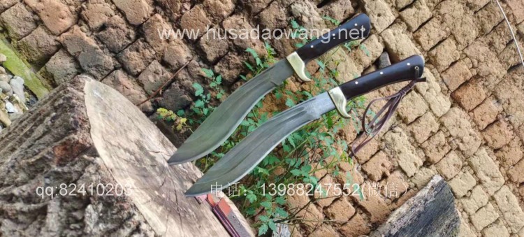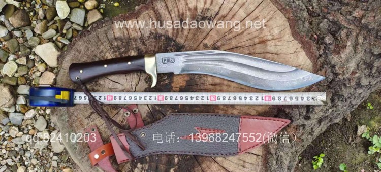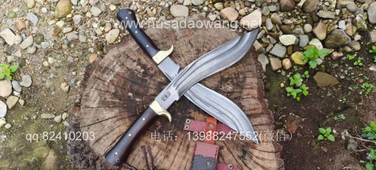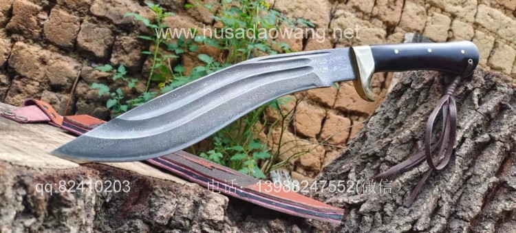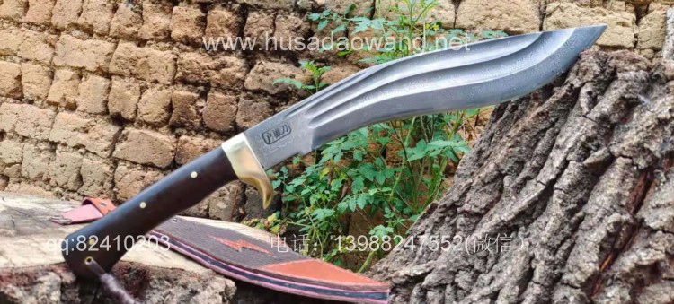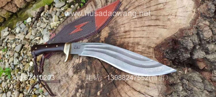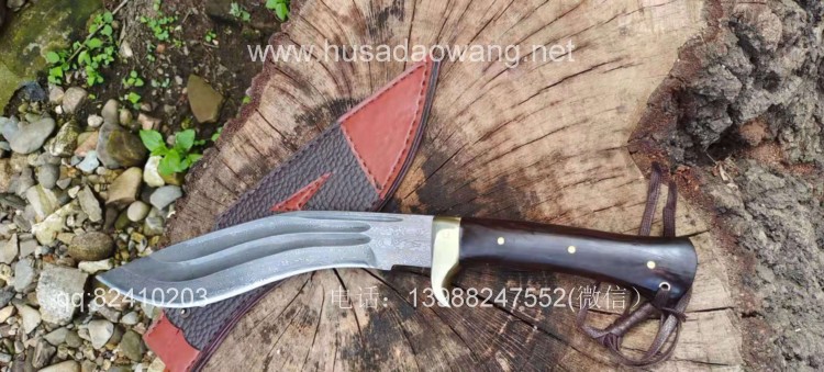 商品名称:户撒刀王(阿昌刀)百炼花纹钢宽槽尼泊尔刀 商品规格:刃长30厘米左右 全长47厘米左右 厚度7毫米左右 商品简介:此刀为户撒优秀匠人精选百炼花纹钢纯手工锻打的精品尼泊尔刀,刀型采用大名鼎鼎的尼泊尔军刀,此种刀型非常适合户外、防身,配重和手感非常舒适,劈砍力度极大,刀条经过匠人千百次反复锻打,并配方淬火,刃口坚硬锋利,轻松过竹砍铁,护手为纯铜手工制作,整个刀条一体全龙骨结构,极为耐用!配高档牛皮刀鞘,是户外把玩理想的选择! 微信:13988247552
