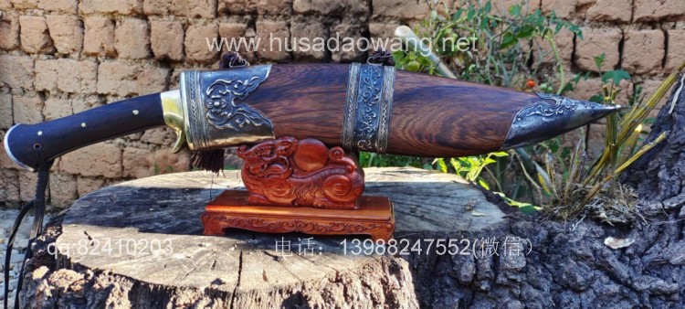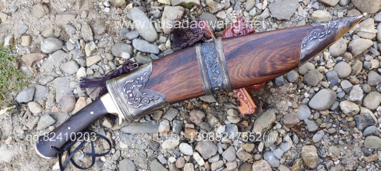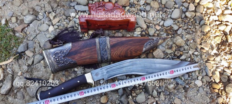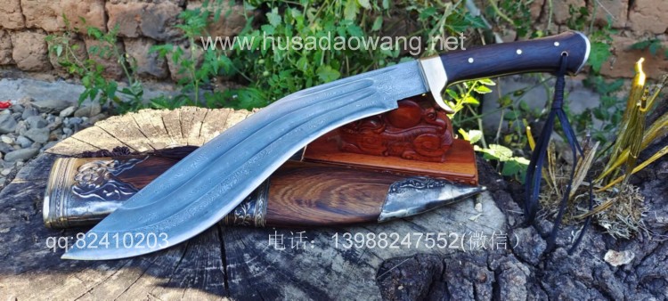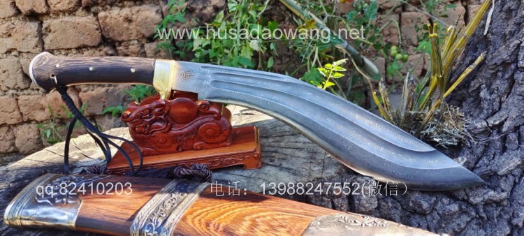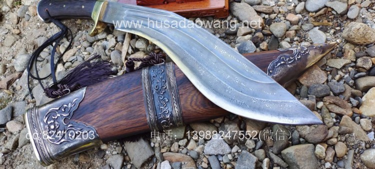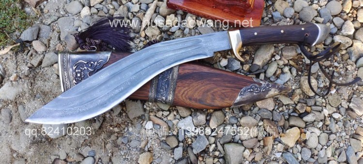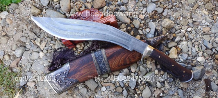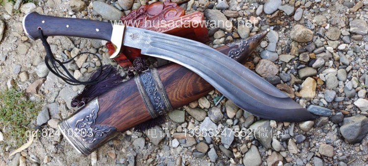 商品简介:此刀为精装大型尼泊尔刀精品系列!钢材选用特硬花纹钢手工锻打配方淬火而成,刀身刚柔相济具有古代冷兵器的一切特征!有所不同的是,这把刀刀身拉有两道大血槽,这样设计既增加了刀的美观程度,而且同时增加了刀体强度和减低配重,不至于在频繁使用中很快使人脱力!超强的一体龙骨设计更使得刀身永不折断,配纯铜护手,刀鞘采用上等黑鸡翅木手工制作,外包缅银,也大大增加了刀的美观性和收藏性!