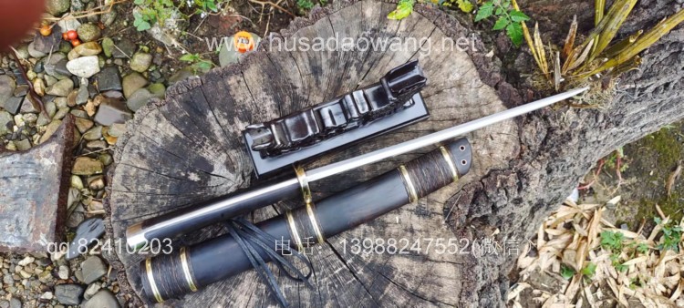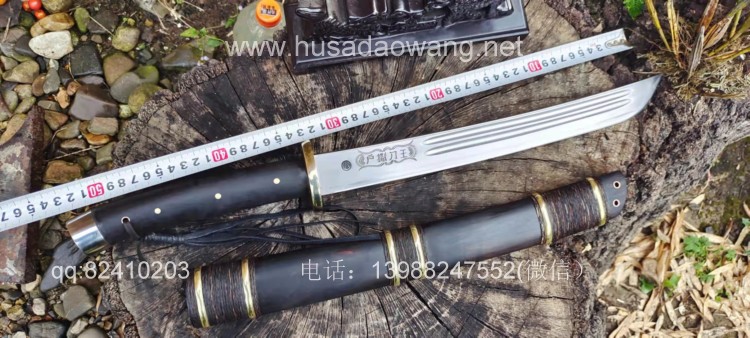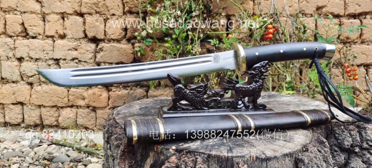 商品简介:此刀由户撒刀省级非物质文化传人杨茂方亲手打制,为经典的背厚刃薄大威力短马刀,刀身开两道血槽,起到调整配重和加固刀身强度的作用,也更显得峥嵘霸气!此刀刀型美观流畅,刀条经过匠人千锤百炼后配方淬火而成,钢火一流,并且刚柔相济,砍断铁丝就如同砍韭菜一般,一体全龙骨打造坚固耐用,尾端手工加钢,增加了户外锤击作用,刀鞘刀柄为优质黑檀木手工制作,外部加综丝和铜圈固定,宝刀入鞘严丝合缝,收藏把玩户外极好的选择!
