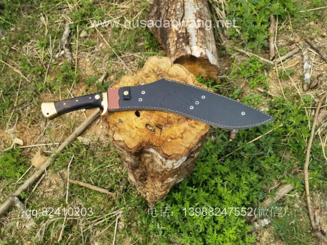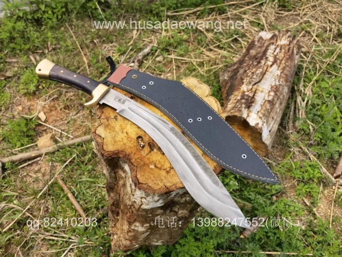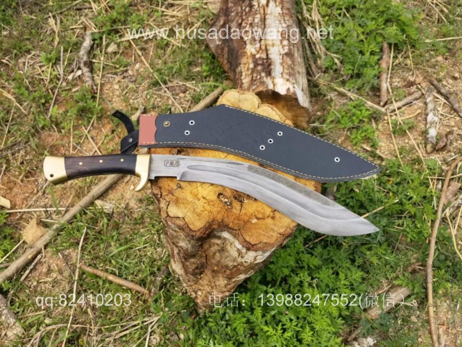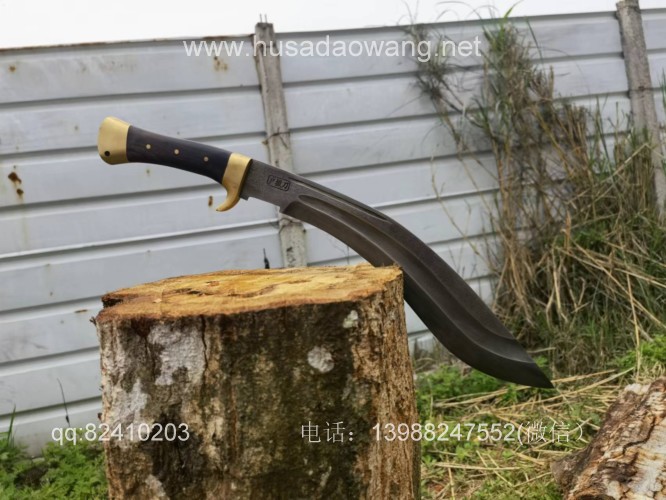 商品名称:户撒刀王(阿昌刀)实心铜装尼泊尔刀 商品规格:刃长37厘米左右 全长52厘米左右 厚度7.5毫米左右 商品简介:这款刀由户撒知名刀匠采用特硬百炼花纹钢全手工锻打的精品凹槽尼泊尔刀,刀型优美,性能强悍,轻松砍铁过竹,刀体上的凹槽既起到了美观作用通时减轻了刀身重量而且使刀体更加坚固,尾端和护手为实心黄铜手工制作,更增加了刀的美观和实用性,一体全龙骨刀身永不折断松动!户外把玩收藏的好刀!