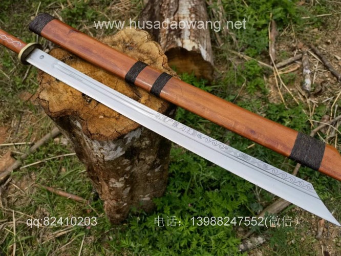 商品名称:户撒刀王(阿昌刀)民族装全龙骨斩马刀 商品规格:刃长64厘米左右 全场101.5厘米左右 厚度1厘米左右 商品简介:此斩马刀为户撒刀王项老赛大徒弟精选高碳锰钢全手工锻打而成,刀型为刀中之霸斩马刀造型,一体全龙骨锻打刀条,结实耐用永不松动!刀条线条流畅,刃口刚柔相济,砍铁不伤!刀鞘刀柄为优质红酸枝手工制作,刀柄增加户撒工艺中非常独特的镶丝工艺,显得更加具有民族特色,并且更加精美!欢迎大家定做收藏! 微信:13988247552