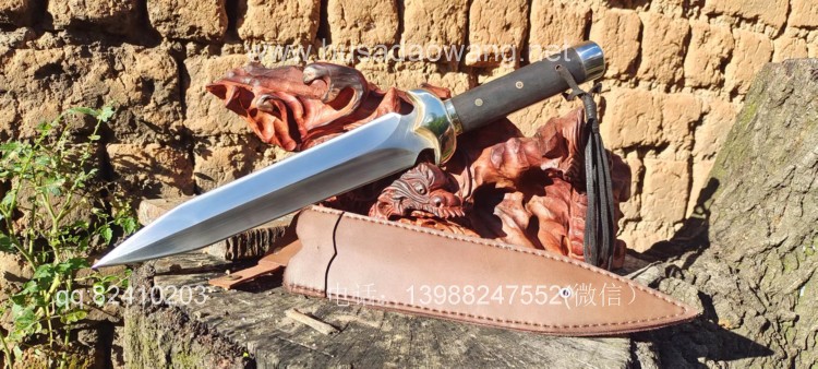 商品简介:短剑采用性能极好的户撒红钢全手工锻打,一体全龙骨剑身,刀身千锤百炼后淬火而成,性能非常强悍,轻松砍铁,而且穿刺能力极佳,穿铁皮桶根本不用使劲,护手为实心纯铜纯手工磨制,整体做工效果非常精细紧致,尾端带击锤,户外做锤击使用,配高档手工缝制的牛皮刀鞘,收藏、实用、户外一体的好剑!