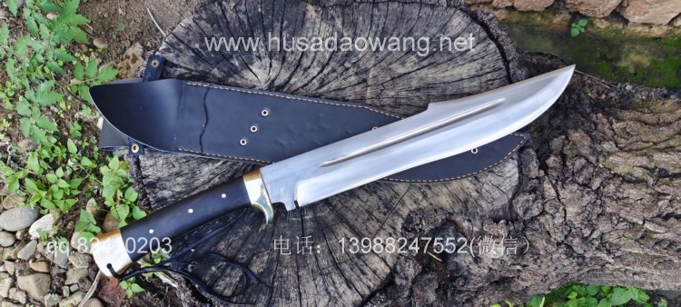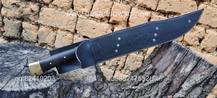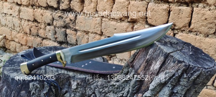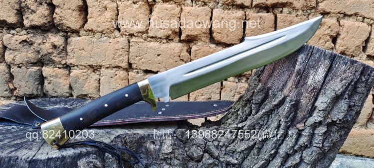 商品简介:这款刀为重型开路型砍刀,看似不大,其实已经是一款不小的开山刀,刀型非常犀利美观,刀尖往后开有假刃,更增加了刀的户外穿刺能力,刀体采用军用车弹簧板手工锻打淬火而成,性能绝佳,因为刀体厚重所以劈砍能力极强,胳膊粗的树枝应声而断,护手和尾端采用实心黄铜制作,美观结实防锈能力也大大增强,这把刀手感沉重,适合力气的大的朋友使用。