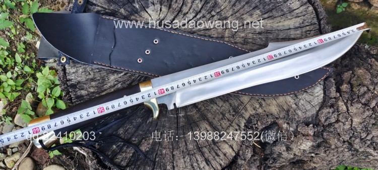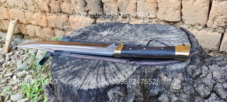 商品名称:户撒刀王(阿昌刀)精品户外开路先锋 商品规格:刃长41厘米左右 全场61厘米左右 最宽处7厘米左右 商品简介:这款刀为重型开路型砍刀,看似不大,其实已经是一款不小的开山刀,刀型非常犀利美观,刀尖往后开有假刃,更增加了刀的户外穿刺能力,刀体采用军用车弹簧板手工锻打淬火而成,性能绝佳,因为刀体厚重所以劈砍能力极强,胳膊粗的树枝应声而断,护手和尾端采用实心黄铜制作,美观结实防锈能力也大大增强,这把刀手感沉重,适合力气的大的朋友使用。