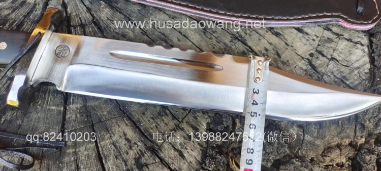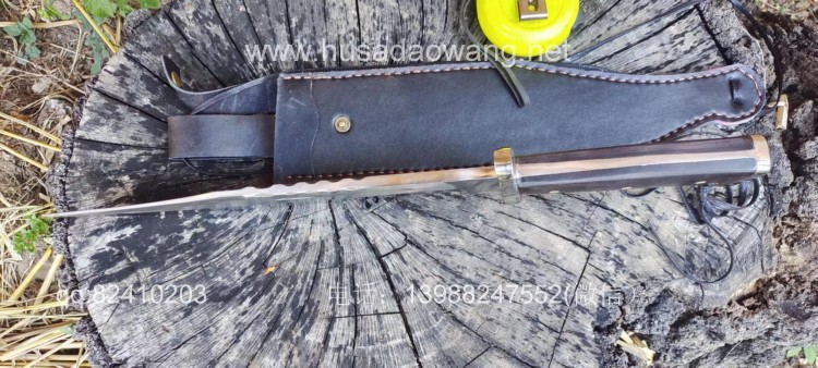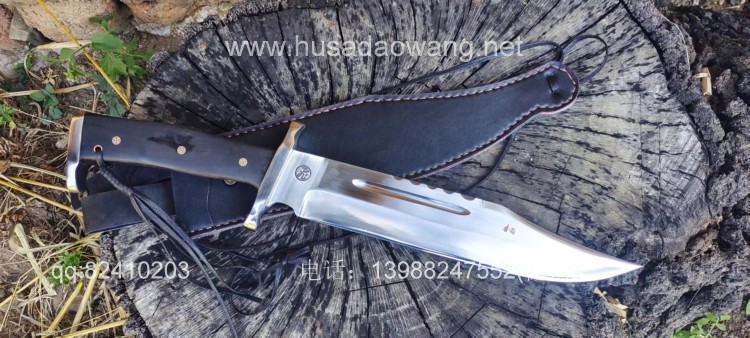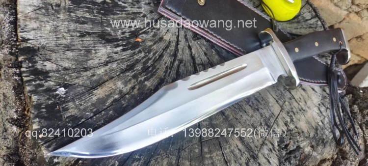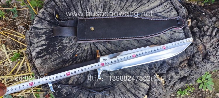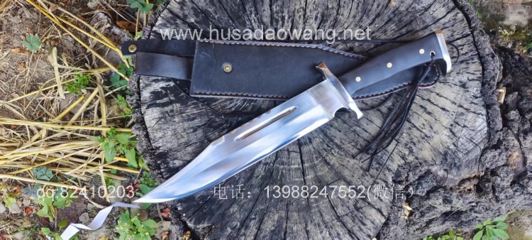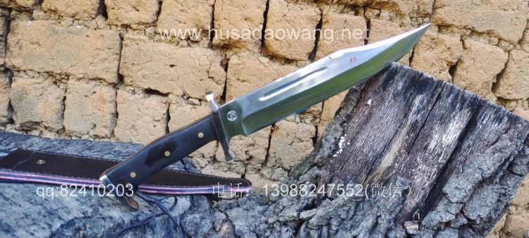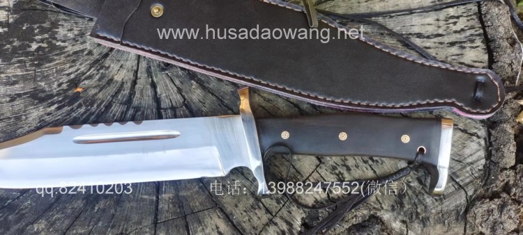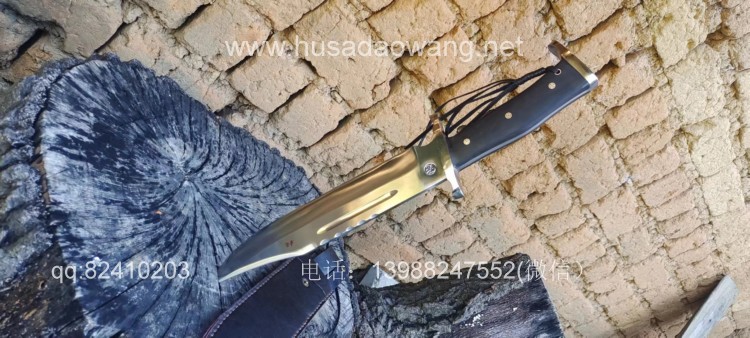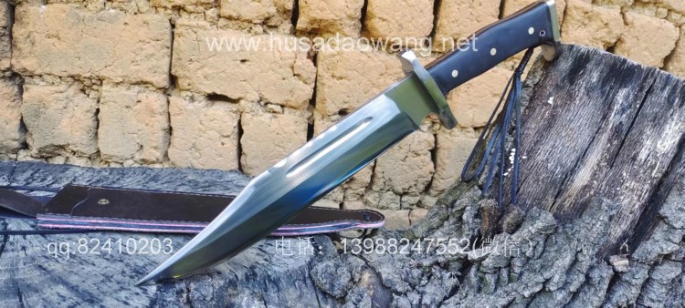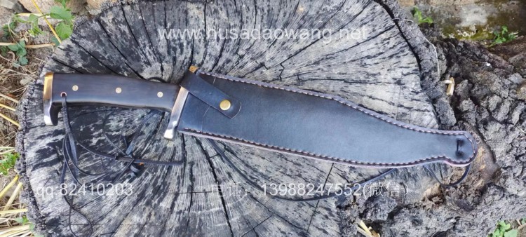 商品名称:户撒刀王(阿昌刀)一体全龙骨兰博户外刀 商品规格:刃长30厘米左右 全长46厘米左右 厚度6毫米左右 商品简介:此刀为军用解放车弹簧板手工锻打而成,性能优良,斩铁截钉,刀型形制 为户外而生,尖端锐利并且刀尖上扬,因此穿刺效果极佳,刀身线条流畅,一体全龙 骨结构,整体设计没有一点多余之处,紧凑犀利,乃户外神兵!联系定做微信: 13988247552