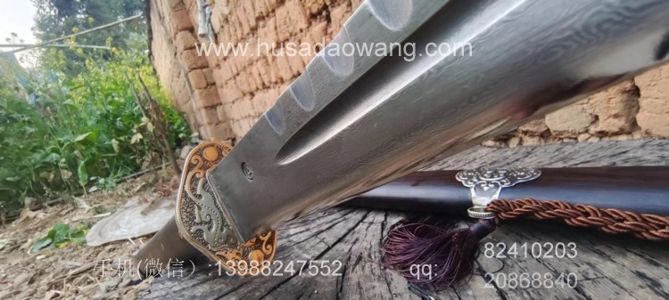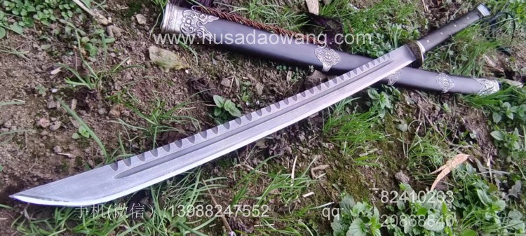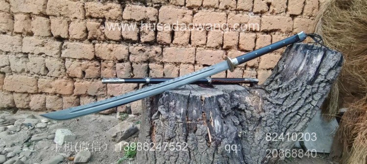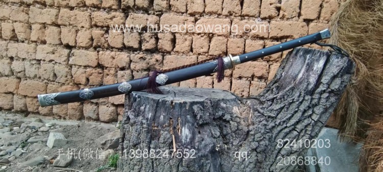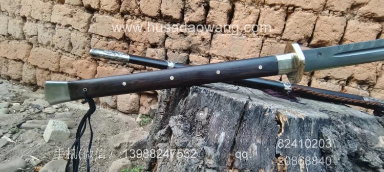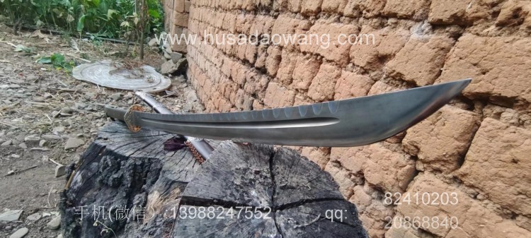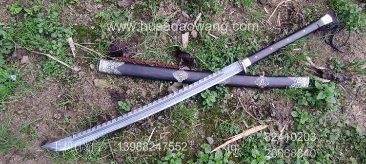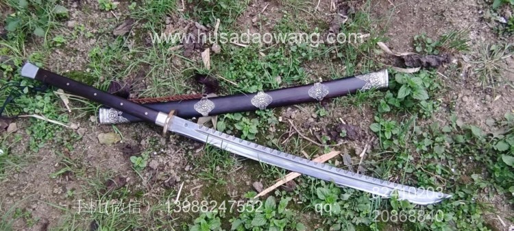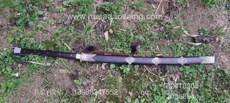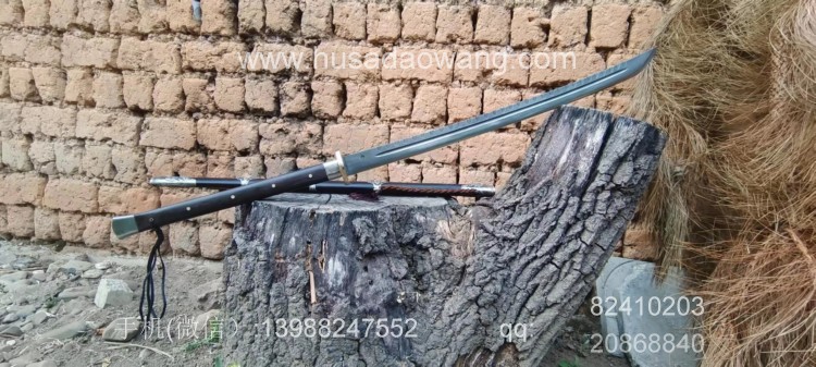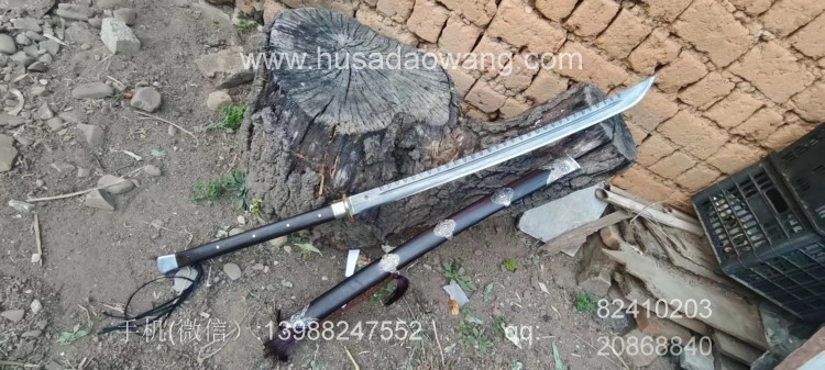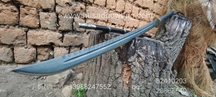 商品名称:户撒刀王(阿昌刀)百炼钢凹槽长柄马刀 商品规格:刃长75厘米左右 全长120厘米左右 厚度9毫米左右 商品简介:这款马刀采用百炼花纹钢一体全龙骨手工锻打,刀型峥嵘独特,刀柄加长,更利于双手持刀发挥刀的最大威力,刀背刻有凹槽,更增加了这把刀的震慑力同时也使得这把刀更具硬汉魅力,让人魂牵梦绕,这把刀因为自重较大,粗锋可轻松砍断钢筋,手柄和刀鞘为优质黑檀木手工制作,外包缅银而成,日常用来演练和收藏都非常具有价值! 需要定做可加V:13988247552