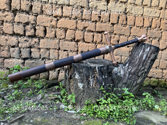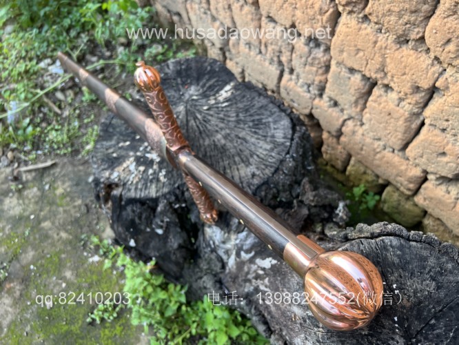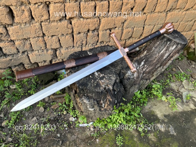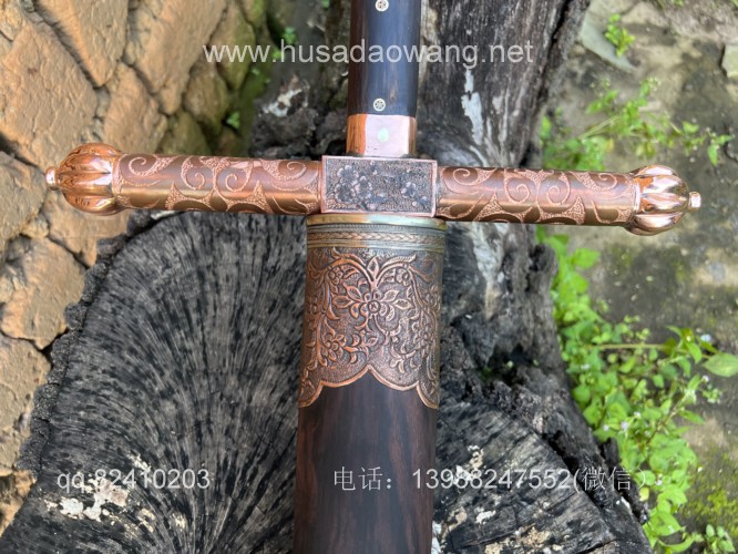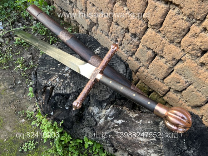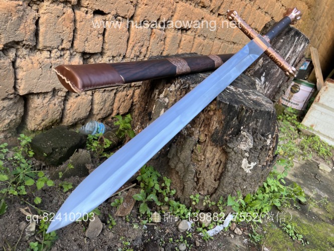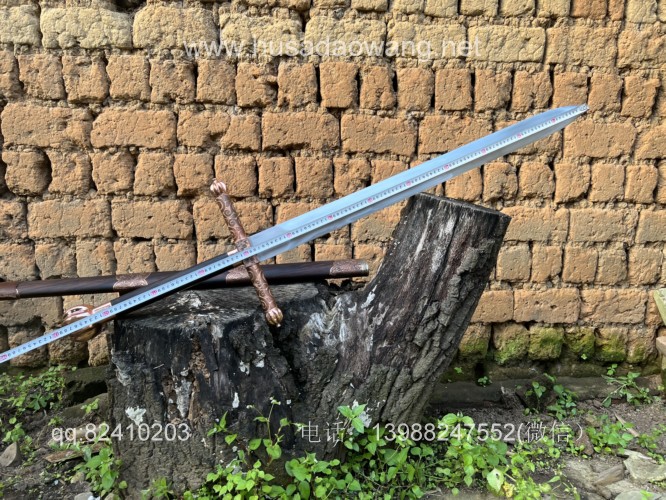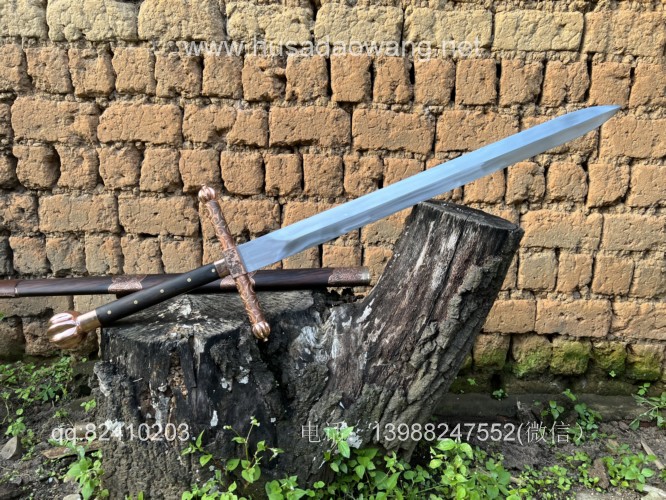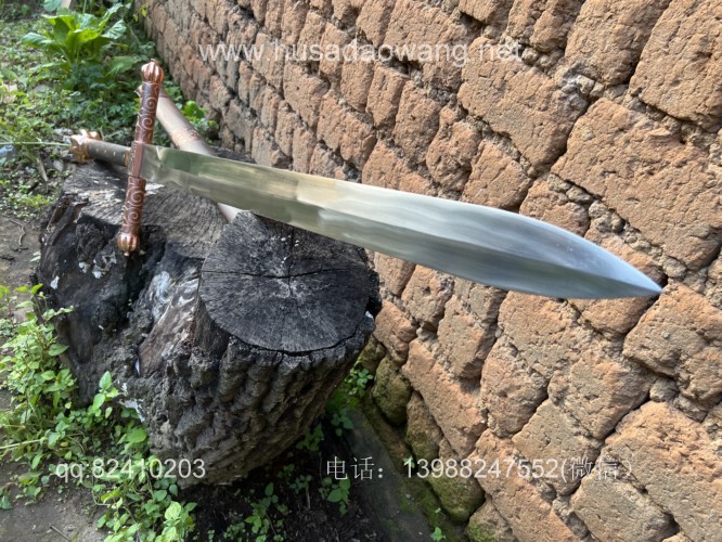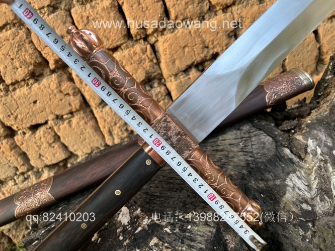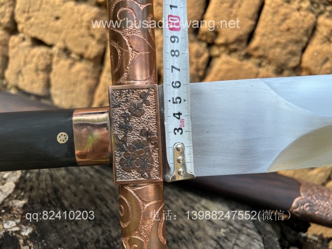 商品名称:户撒刀王(阿昌刀)收藏级巨剑 商品规格:刃长88厘米左右 全长122厘米左右 宽度6厘米左右l 商品简介:这是给客户加工好的一把剑中的巨无霸,一体全龙骨锻打!从业以来最大的一把剑,刃长88厘米 全长122厘米 宽度6厘米,护手和尾端为紫铜制作,铜件为客户自行邮寄过来,只是铜件的制作就价格不菲,整个剑不带剑鞘达到二十斤,十分的巨大,定此宝剑的客户为当地一家知名健身馆教练,十分喜爱重型冷兵器,这把宝剑做工精细并且霸气难掩!实在是剑中之王! 联系微信:13988247552