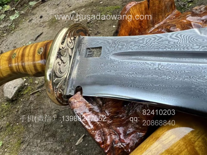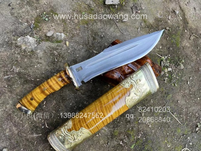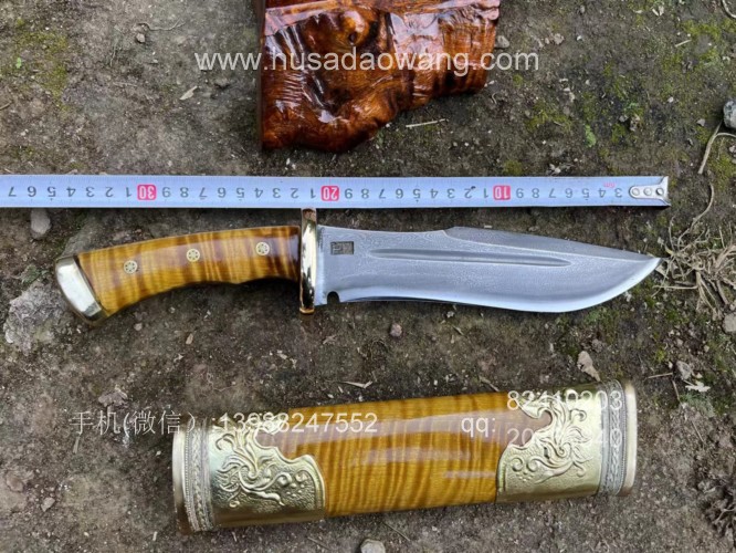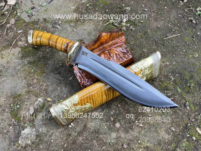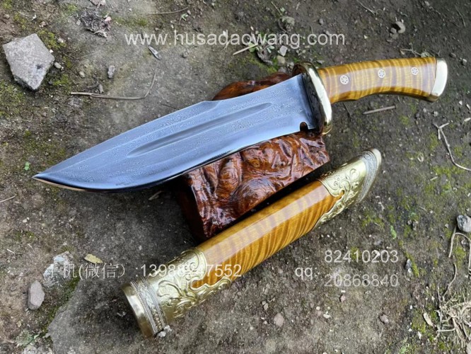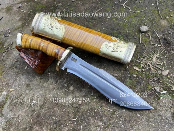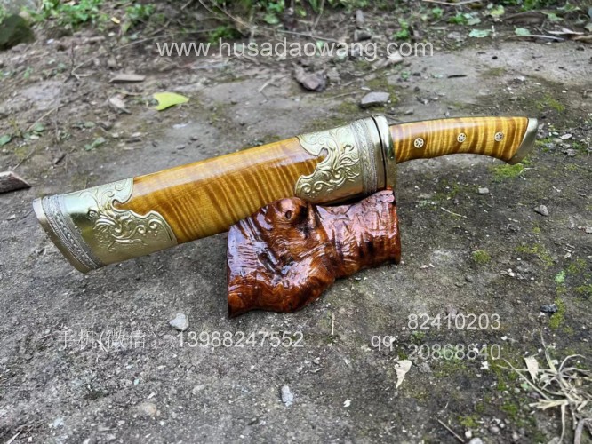 商品名称:户撒刀王(阿昌刀)精品金丝楠木猎刀 商品规格:刃长20厘米左右 全长34厘米左右 厚度7毫米左右 商品简介:户撒传统工艺纯手工锻造的精品水波纹金丝楠木猎刀,百炼花纹钢精锻刀条,一体全龙骨锻造刚柔相济性能出众!刀鞘刀柄为极品水波纹金丝楠木手工制作,外包黄铜,皇家气质!短刀收藏极品,不要错过! 户撒刀联系微信:13988247552