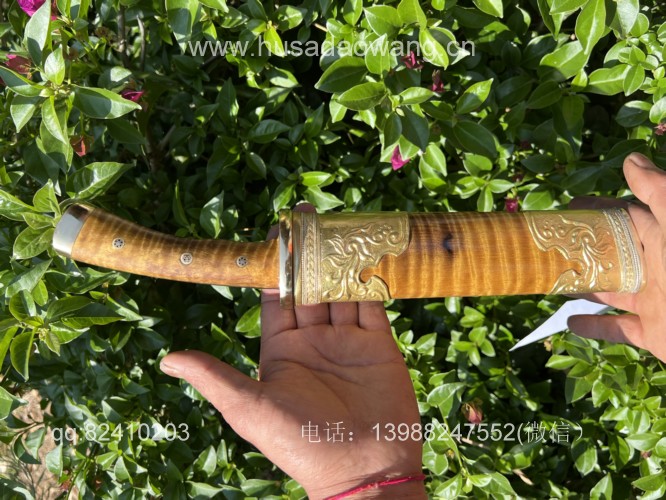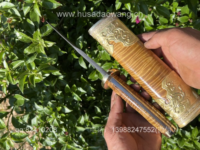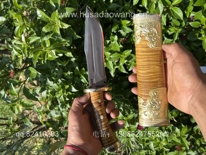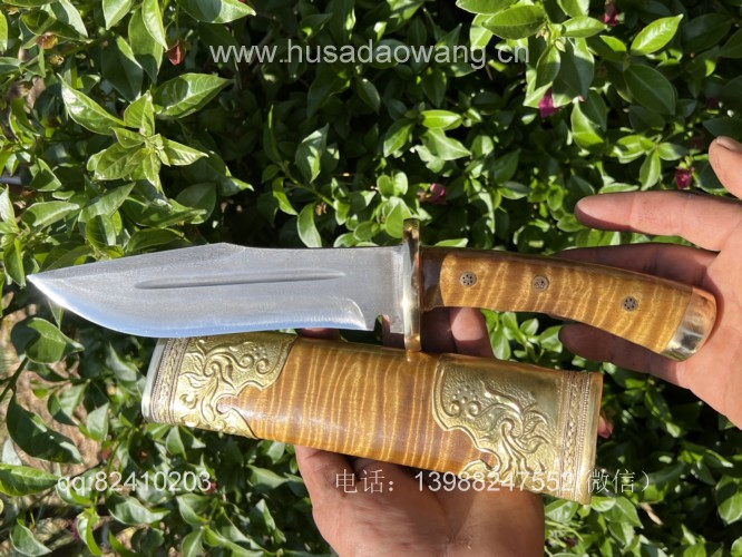 商品名称:户撒阿昌刀王精品金丝楠大猎刀 商品规格:刃长17厘米左右 全长32厘米左右 商品简介:这款大猎刀造型威猛采用特硬百炼花纹钢手工锻打,性能极佳,劈砍穿刺都非常出色,手柄和刀鞘采用优质阴沉金丝楠木手工制作,护手和尾端都为实心纯铜手工制作打磨,刀鞘外包黄铜,充满皇家质感,让人爱不释手! VX:13988247552