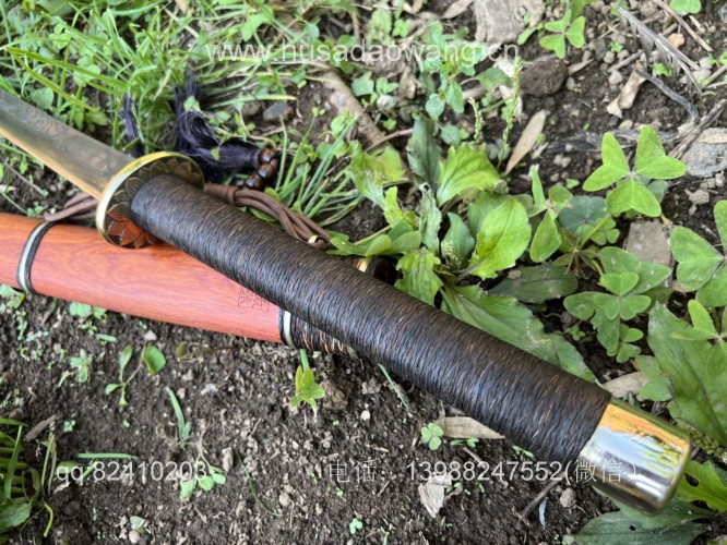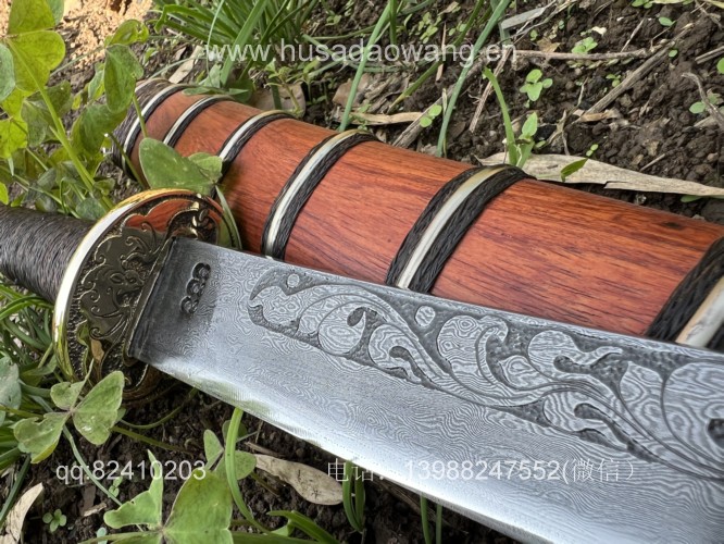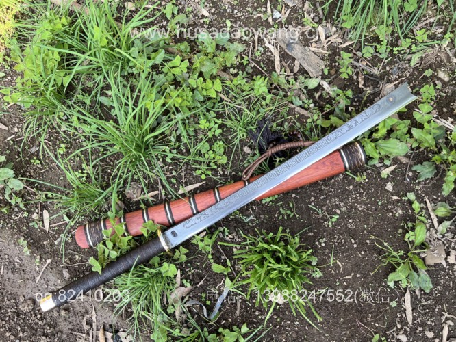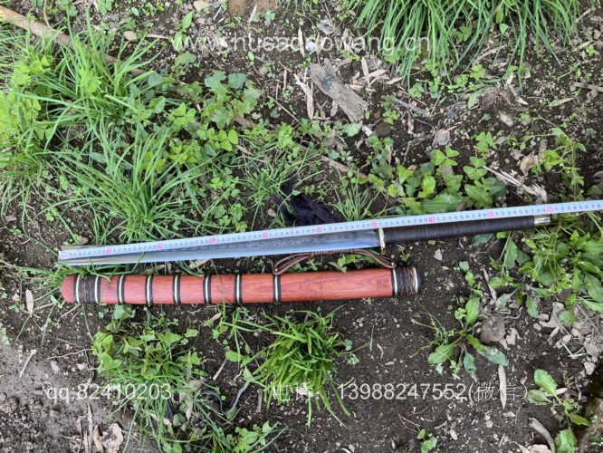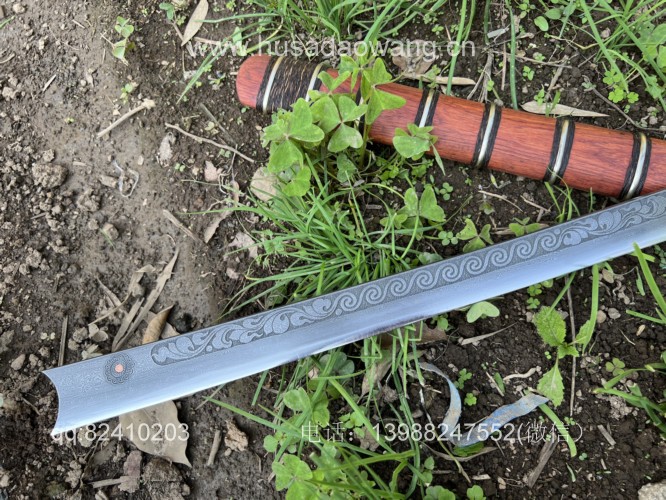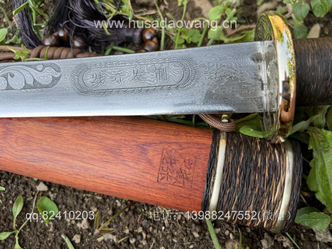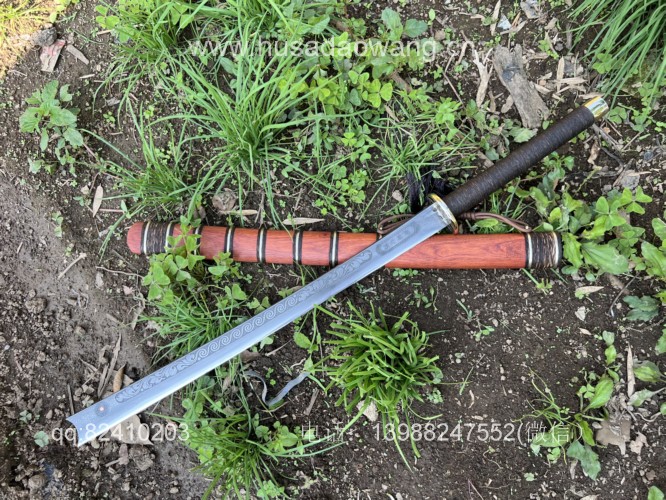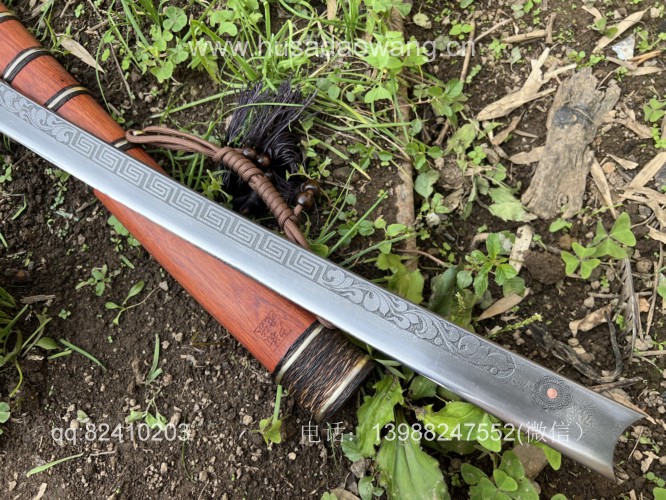 商品名称:户撒阿昌刀一体龙骨高端平头刀(线乔发制) 商品规格:刃长60厘米左右 全长90厘米左右 商品简介:这款刀由户撒刀一流刀匠线乔发采用特硬花纹钢手工锻造而成,一体龙骨结构,解释耐用,刀身手工雕刻龙凤等吉祥图案惟妙惟肖,手柄精缠棕丝,尾端加防撞实心黄铜,刀鞘为优质红酸枝手工制作,性能一流斩铁截钉~! VX:13988247552
