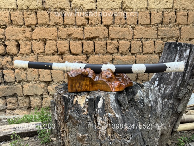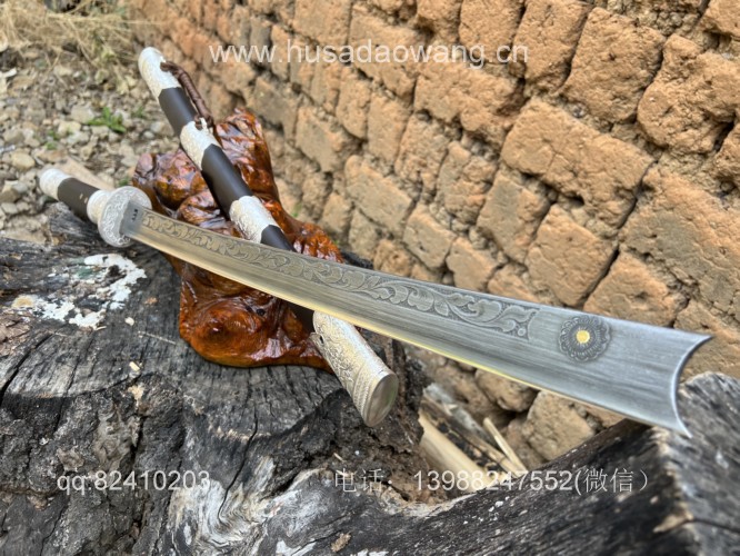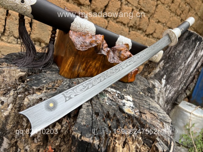 商品简介:这款刀由户撒刀嫡派传人线乔发纯手工锻造,刀条采用特硬百炼花纹钢千锤百炼配方淬火而成,刚柔相济斩铁截钉,一体全龙骨锻造结实耐用,刀条表面手工雕刻唐草花纹,古香古色,刀鞘刀柄采用优质黑檀木手工制作,包厚99纯银配件,收藏实用皆可!