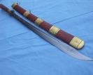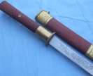 产品介绍: 此刀由户撒名匠全手工打制的精品关刀,刀身采用汽车弹簧钢板手工锻打淬火,雕琢有精美的纹饰.做工精良,刀的钢火一流!刀鞘刀把为名贵木材缅檀并镶饰精美铜装.独具一格的刀款华贵古朴大方.只此一把,好车易得,宝刀难求,极其收藏价值!!