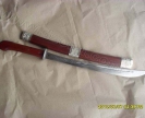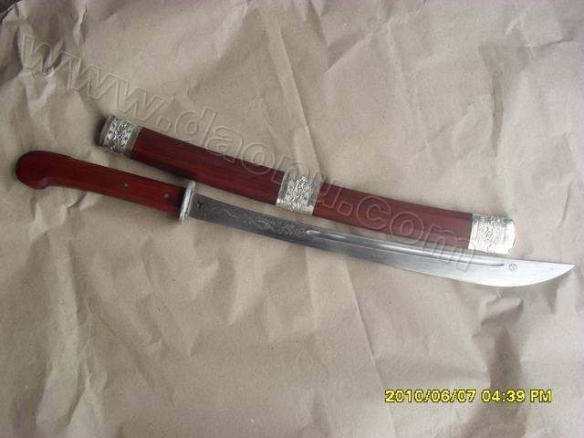 产品介绍: 此刀由户撒名匠全手工打制的精品木木绑刀,刀身采用汽车弹簧钢板手工锻打淬火,刀身精雕龙凤等花纹,精铜红木刀装,可砍断铁丝.、铁钉不伤刃,刀照片因压缩影响清晰度,实物更好!此刀本月促销, 答谢刀友支持,过期不候!(细节图请看网页左边商品相册)