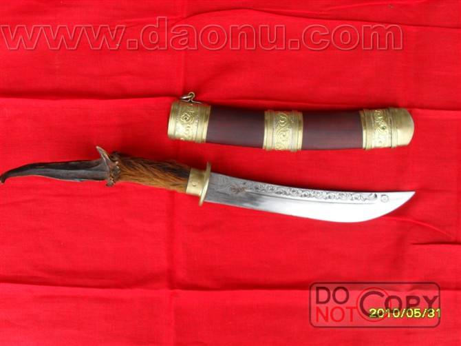 产品介绍: 此刀由户撒名匠线乔发全手工打制的精致极品鹿角小苗刀,刀身采用汽车弹簧钢板手工锻打淬火,刀身精雕龙凤等花纹,刀鞘为大叶紫檀木制作.刀把为优等纯野生鹿角制作,此刀精致锋利!收藏极品!