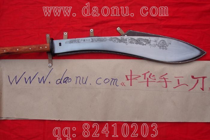 产品介绍: 本站隆重推出此刀!此刀资深刀友提供大体想法,由我们中华手工刀网联合户撒名匠线乔发和项老赛儿子联手打造现中国最大、最具有霸气的全手工狗腿刀,整刀重达6斤以上!采用进口弹簧钢板(也称高锰碳钢,我们站所有的刀都是用这种钢材打造的),刀条打制时间整整两天,在刀匠的挥汗如雨中,这把震撼性的邹品诞生了!刀一出来给刀友们的第一感觉是大气如虹,如同兵器中的霸王项羽,刀寒光闪闪,砍铁不伤,刀刃雕工细腻如丝,刀柄采用优质酸枝木手工制成,刀柄七颗目钉全龙骨制作,结实异常!现在请大家好好欣赏吧!收藏极品! 此刀超重,购买时请量力,呵呵。