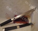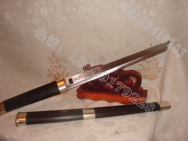 产品介绍: 户撒刀名匠线乔发结合古代唐刀造型,采用最精湛的传统锻造工艺,精选优质弹簧钢打造的乌木装小唐刀,经过多次加工淬火工艺,刀装采用名贵乌木制作,刀装手工包铜,此刀寒光闪闪,砍铁不伤,而且因钢材精挑细选,所以在砍断铁丝的同时,刀的锋利程度还是很不错的。是收藏级别的佳品,请大家快速选购订做。