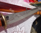 产品介绍: 此刀为户撒刀名匠线乔发全手工精心打制,刀条为传统马刀样式,多次淬火而成,刃口在砍铁的同时也比较锋利,刀身精雕龙凤,刀装为精品楠木刀装,是传统户撒刀精品系列!传统收藏请勿错过!