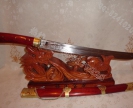 户撒刀介绍: 此刀样式美观流畅,户撒传统小马刀风格,加上名匠乔发的个人发挥使此刀显得更加精美、彪悍。此刀用优质汽车弹簧钢板(也称高锰碳钢,我们站现今所有的刀都是用这种钢材打制而成)经户撒名匠线乔发精心打制而成,独到的淬火工艺,经过无数的反复锻打而成,此刀口坚硬寒光闪闪,可轻松斩过竹削铁,刀身雕工细腻如丝,精雕龙凤栩栩如生,这把刀装为缅甸精品酸枝木(红木中最好的一种木料,油性大,分量重,在北方干旱情况下不开裂,本站极品刀剑都推荐此种木料)刀鞘包铜精心而成。爱刀者理想收藏!请勿错过。此刀订货者众多,理想的收藏实用佳品!