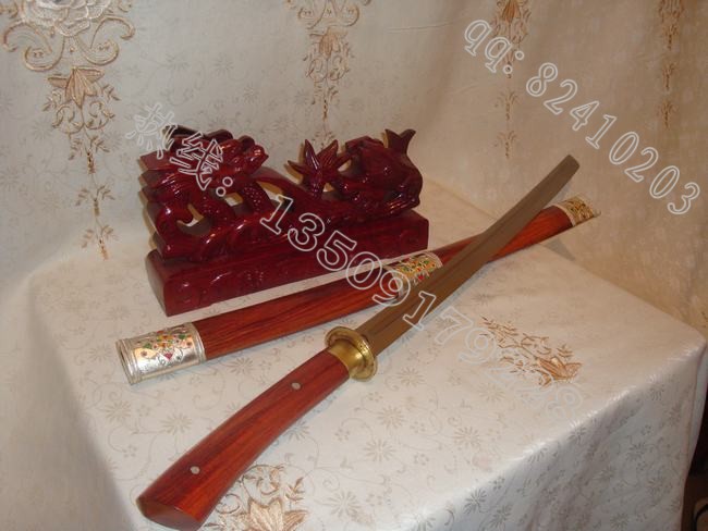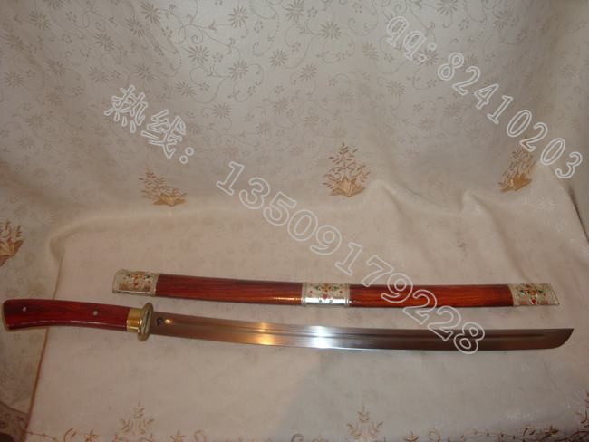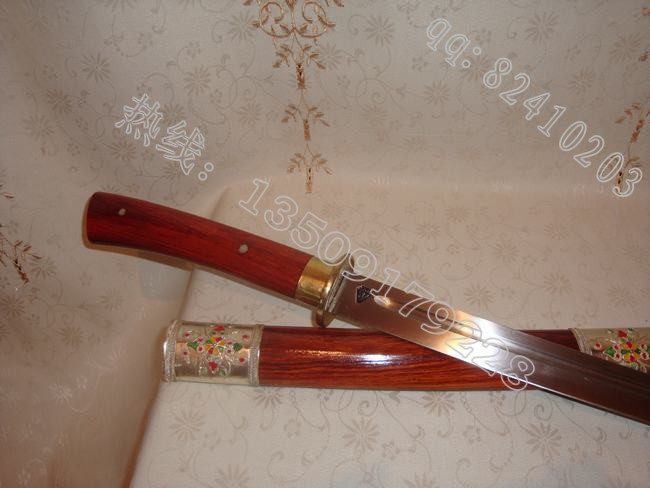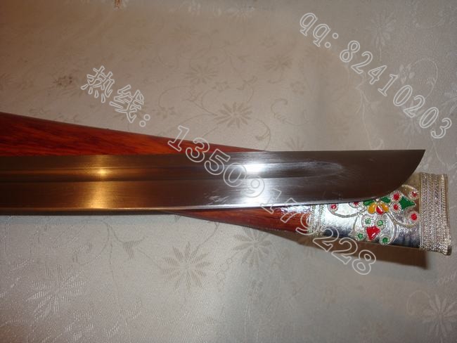 户撒刀介绍: 此刀为户撒当今马刀之极品,经户撒名匠黎有兴采用本站独家进口的特殊钢材精心打制而成,这种钢材锻打难度极高,经过不断实践反复锻打,刃口数次特殊方法淬火,此刀横空出世,此刀口做工细腻,线条流畅,刃口硬度极高,客户收到后砍断钉子后竟然找不到刃口砍钉子的地方,刀身防锈能力也大大超过户撒当地的高弹锰钢系列,收藏价值也进一步提高。因此客户对此刀极为喜爱,立即决定再做一把。此刀可比拼国内价格过万的刀具,这把刀装为缅甸精品酸枝木(红木中最好的一种木料,油性大,分量重,在北方干旱情况下不开裂,本站极品刀剑都推荐此种木料)外包缅银,此刀刀装也是一个亮点,整体包优质缅银,刀装师傅也是户撒最好的师傅,使整刀显王者风范!收藏极品,不可多得。