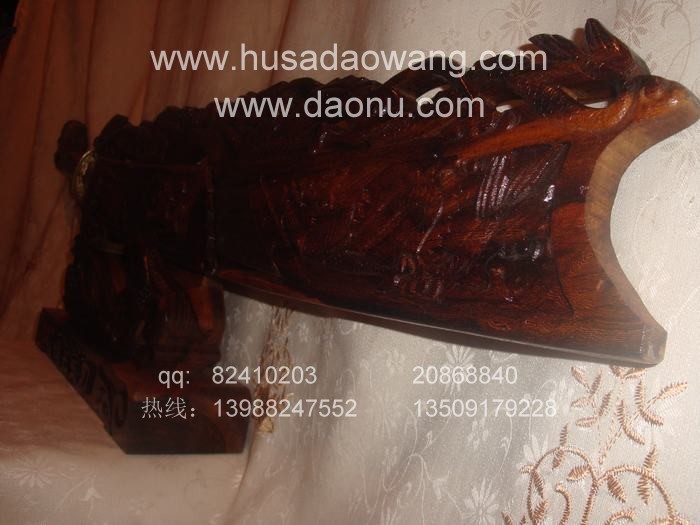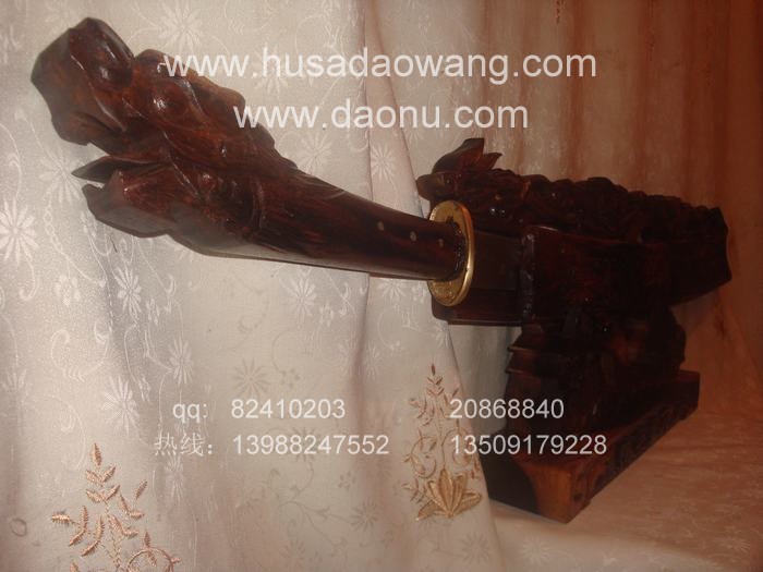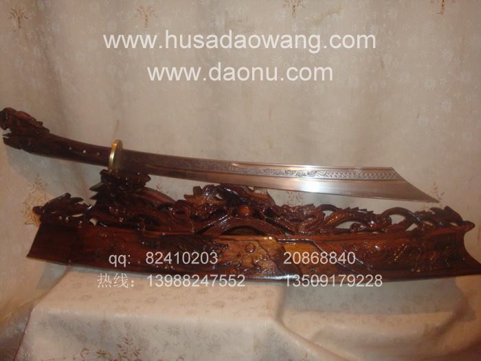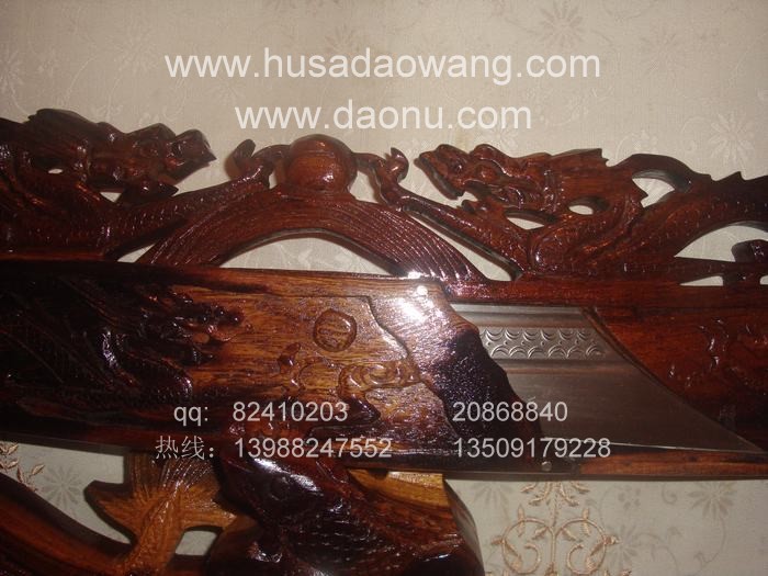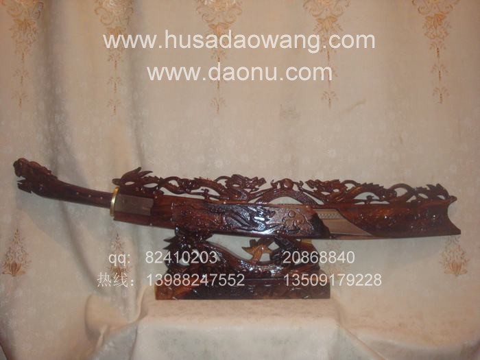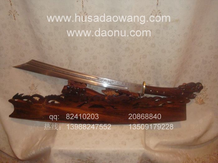 产品介绍: 此刀由户撒优秀匠人全手工打制的精品镇宅斩马刀,刀身采用汽车弹簧钢板手工锻打淬火,千锤百炼而成,刃口坚硬粗锋可砍断铁钉不伤刃,刀身精雕龙凤等花纹。刀装采用缅甸及其名贵的鸡翅木精雕细琢而成,整体感官大气高贵,气势如虹!收藏集玩家的首选!收藏极品! (商品图片经压缩清晰度下降,真品更好),另外答谢刀友,购买此刀者赠送下图精品刀架(价值500元)请大家抓紧时间定制。工期为40天左右