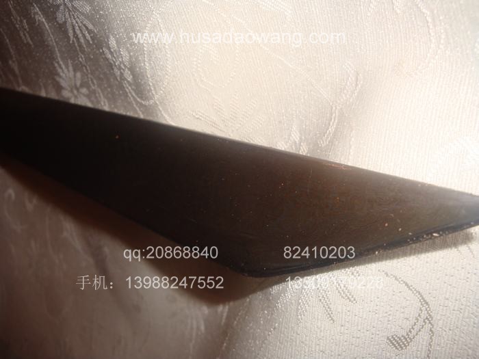 4、刀条硬度及性能不同:户撒刀(阿昌刀)因为采用了局部淬火工艺,且材料不一,所以,刀与刀的硬度是不同的,就是同一把刀子,刀背刀口、刀根刀尖等硬度也不一样,一般说来刀条根部因很少使用,淬火很浅,刀尖细小部位从实用性来讲为了防止过硬而断裂,所以刀尖也很少淬火,最终讲的是刚柔相济;而机制刀具,硬度单一,刃口硬度经常不能达标,一般销售时只标识一个硬度,如57;