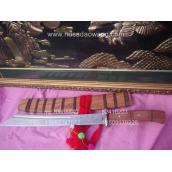 作品介绍: 此刀为增强版的宽鞘小斩马刀,由户撒优秀匠人线兴过(除了雕花工艺不及乔发,其他方面的制刀技艺连第一名匠线乔发也伸大拇指)纯手工锻打而成,刀条采用军用汽车弹簧钢板经过传统炭炉煅烧,纯手工反复锻打而成,刀条采用户撒独特复合淬火方法,刚柔相济,粗锋可砍断钢筋,细锋可轻松过竹。此刀整体浑厚霸气,刀刃加宽加大,刀柄刀鞘采用优质红酸枝外套当地民族风格的棕丝,整体结实耐用,威武霸气,为户外野营和个人收藏理想刀具。此刀订购者络绎不绝,欢迎大家选购!
