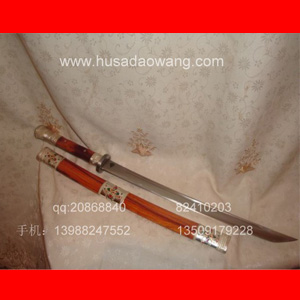 作品介绍: 此刀为户撒顶级钢材及工艺制作的一把经典款式,刀条经户撒名匠黎有兴或线兴过采用本站独家进口的高档钢材采用特殊打法精心打制而成,这种钢材锻打难度极高,对炉火温度要求很高,刃口数次特殊方法淬火,经过匠人超大工作量锻打,刀口硬度极高,可在锋利状况下砍断铁钉(砍钉过程铁钉下面垫硬木墩或者软铁墩,刀口垂直铁钉砍下)而不伤刃口,整刀采用全龙骨设计,刀条一体而成,因此刀身更加结实耐用。此刀身防锈能力也大大超过户撒当地的高弹锰钢系列,收藏价值也进一步提高。此刀在硬度性能方面可比拼国内价格过万的刀具,这把刀装为缅甸精品酸枝木(红木中最好的一种木料,油性大,分量重,在北方干旱情况下不开裂,本站极品刀剑都推荐此种木料)外包缅银,刀装师傅也是户撒最好的师傅,使整刀显王者风范!收藏极品,不可多得。购买方法:找到喜欢的作品,请联系客服进行购买,qq:82410203 手机:13988247552 或13509179228 ,货款支付方式:新客户推荐淘宝链接支付宝方式,绝对保障客户的利益;老客户可采取银行付款方式(方便我们做银行转账,这是对我们的有力支持,我们对这样可顾客表示感谢)