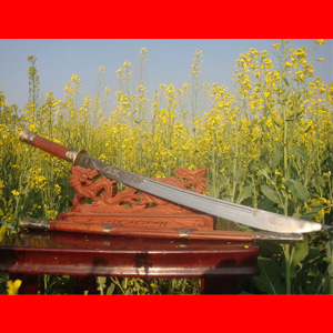 商品介绍: 此刀为阿昌族户撒第一刀匠线乔发全手工精心打制,刀条采用优质军用高碳锰钢,传统锻打并民族雕花工艺,千锤百炼后秘方淬火热处理而成,刀身传统民族苗刀款型,刀刃流畅,刀身乔发亲自雕龙,神气活现,民族风味独特,粗锋可砍铁丝,细锋可轻松过竹,刀柄刀鞘为精选天然珍稀红酸枝,精选老料,刀鞘精包缅银,民族做法。经典民族收藏。请大家抓紧时机选购收藏。