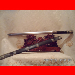 作品介绍: 此剑为户撒当今宝剑之顶级系列,剑条经户撒名匠黎有兴采用本站独家进口的特殊钢材精心纯手工锻打而成,此种钢材锻打难度极高,剑身要经过反复多次锻打,刃口也需数次特殊方法淬火,而后宝剑鼎成,此剑做工扎实,线条流畅,刃口硬度极高,经反复淬火回火后刃口达到刮毛还能砍断铁丝的境界,刀身防锈能力也大大超过户撒当地的高弹锰钢系列,收藏价值也进一步提高。此次制作,比前面制作更为加强,采用全龙骨设计,使得整个宝剑更为结实耐用,剑尾端也进行包缅银处理。此剑剑鞘采用名贵黑檀木外包缅银,此剑装也是一个亮点,整体包优质缅银,剑装师傅也是户撒最好的师傅,使得此剑显王者风范!收藏极品,不可多得。