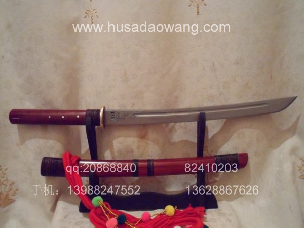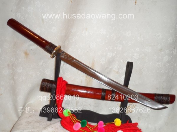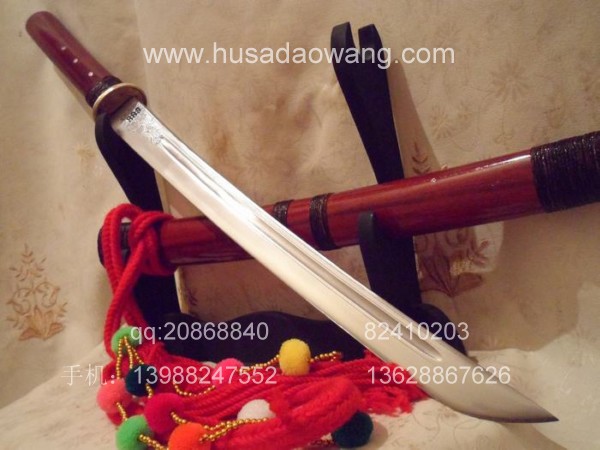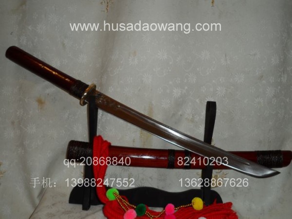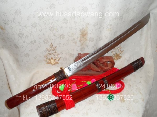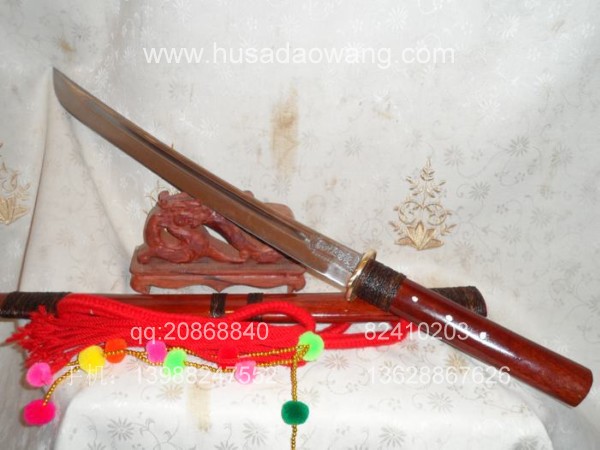 介绍: 此刀由户撒刀嫡派传人线乔发精工打造,款式为户撒传统马刀风格,风格质朴、干练。刃材采用优质军用汽车弹簧钢板(也称高锰碳钢,或锰65)刀条经匠人千锤百炼而成,加之以功底深厚的淬火工艺,此刀口坚硬寒光闪闪,可轻松过竹削铁,刀身兼有乔发亲手精雕花草,栩栩如生,此刀装为大叶紫檀也称缅红,刀鞘刀柄精缠棕丝,刀柄打2颗以上铆钉,另根部的棕丝使得整刀劈砍发力更为直接,更增加了耐用程度!好刀一出订者络绎不绝,此刀在户撒当地也非常受欢迎!