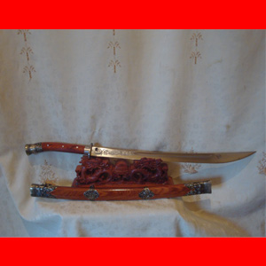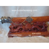 商品介绍: 此刀为户撒刀嫡派传人线乔发全手工精锻打而成,刀条精选优质军用高碳锰钢,户撒传统方法锻打线乔发亲自民族雕花工艺,刀条经千锤百炼后秘方淬火热处理而成,其刀身形状为传统民族苗刀款型,线条流畅,刀身乔发亲自雕龙,神气活现,民族风味独特。线乔发刀条以淬火独到、刀型漂亮、雕花工艺高超而著称,这把刀粗锋可轻松砍断铁丝,细锋可轻松过竹,刀柄采用最为结实耐用的全龙骨造型,刀装为精选天然珍稀红酸枝,精选老料,刀鞘精包缅银。经典民族收藏,实用观赏俱佳。请大家抓紧时机选购收藏。