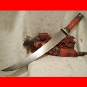 商品介绍: 此刀采用优质高碳锰钢制作,刀条由户撒优秀刀匠采用传统户撒刀锻打工艺锻打而成,此刀原型为正宗古代蒙古骑士佩刀,刀条月牙弧度,劈砍面积增大,骑兵马上做站,挥舞相当有力,威力强大刀!刀型霸气外露,手感出众,挥砍性能卓越,刀条经过匠人千锤百炼后配方淬火而成,刃口锋利坚硬,粗锋轻松砍铁,细锋还可过竹削铁,刀鞘为精选缅甸红酸枝外包缅银!请大家抓紧时间收藏!