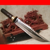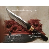 产品介绍: 此刀由本站优秀户撒刀工匠全手工打制的精品兰博丛林刀,原型采用著名国际影视明星史泰龙主演的<第一滴血刀>中的兰博一号丛林刀,此刀身采用精挑军用汽车弹簧钢板全手工反复精锻而成,刃口采用户撒传统配方淬火,刀锋坚硬锋利,粗锋砍铁不伤,细锋的话可达到刮毛效果,刀背带齿,方便对付户外复杂环境,此刀劈砍有力手感舒适,性能手感极好,也是专为广大驴友和户外运动者以及私家车防身使用。此刀刀鞘采用本站独家定制的牛皮内加防潮纸板,非常结实耐用。此刀身黑色部分是煅烧后的自然黑色,如果刀友不喜欢这种黑色,可定制全白版本。