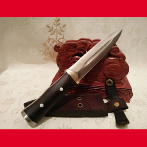 商品介绍: 此刀为户撒优秀刀匠纯手工锻打的一把短小精悍的防身小匕首,刀身采用精选的进口车弹簧全手工锻打而成,刀型为两面匕首型,整体刀条一体,极为结实耐用,刃口反复锻打后配方淬火而成,坚硬锋利,细锋可轻松刮毛。刀柄与刀身一体龙骨制作结实耐用,刀柄尾端手工加钢锭,在户外可做锤击使用,独家设计!刀鞘为上等牛皮纯手工缝制,刀柄加非洲黑檀木,高端大气!此刀短小精悍,做工精致,刀虽小,但因全手工制作,手工相当费工!紧凑实用,收藏把玩防身利器,皮包可就可以放下。
