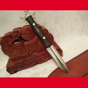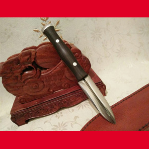 商品介绍: 此刀为户撒优秀刀匠纯手工锻打的一把精致小巧的口袋刀(轻松放口袋中),刀身采用精选的进口车弹簧全手工锻打而成,刀型为两面匕首型,整体刀条一体,极为结实耐用,刃口反复锻打后配方淬火而成,坚硬锋利,细锋可轻松刮毛。刀柄与刀身一体龙骨制作结实耐用,刀柄尾端手工加钢锭,在户外可做锤击使用,独家设计!刀鞘为上等牛皮纯手工缝制,刀柄加非洲黑檀木,高端大气!此刀短小精悍,做工精致,刀虽小,但因全手工制作,手工相当费工!此刀精致小巧,完全可以做防身用刀(符合管制刀具条例)女士也可选购,防狼利器!