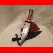 商品简介:此款刀的款式原型为1991年在我国上映的国内著名武侠片《双旗镇刀客》中假侠客草上飞手中的一把刀,双旗镇刀客这部电影是非常值得一看的!影片荣获1991年中国电影金鸡奖最佳美术奖、1992年东京第三届夕张国际惊险与科幻电影节最佳影片大奖、1992年第五届《中时晚报》电影奖商业映演类年度大陆优秀电影奖、1993年柏林电影节国际影评奖,如此厚重的电影堪比《黄土地》、《红高粱》。没看过也可以在网上搜这部片子。这款刀造型犀利,优秀匠人纯手工锻打制作,纯手工打磨,牛皮刀鞘,非常适合收藏把玩,和户外使用,欢迎大家定制!