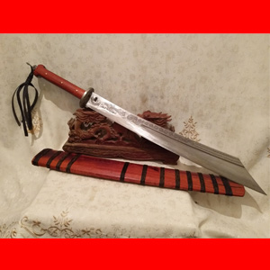 商品介绍:此刀由户撒第一刀匠线乔发全手工锻打,此刀为加宽斩马刀款式,刀身采用优质高碳锰钢,传统户撒刀锻造工艺千锤百炼而成,采用户撒独特的配方淬火工艺,经过工匠精心锻打热处理后,刀身较软,刃口坚硬,达到刚柔相济之功效,刃口纯手工打磨,可以锋利刮毛过竹子,在粗锋情况下砍石板、钢筋不在话下!刀柄设计为一体全龙骨,使得整刀更为坚固耐用永不断裂,刀柄刀鞘采用优选缅甸红酸枝,上等红木防开裂性能极好!此刀手感配重颇好!威武霸气!精品手工刀,欢迎大家前来定制!工期20-25天。