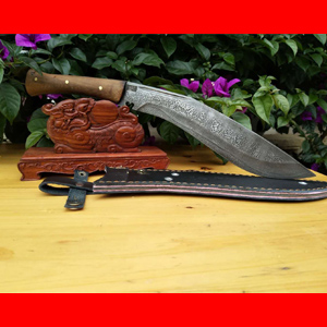 户撒刀简介:此刀由户撒优秀刀匠采用百炼花纹钢全手工锻打的尼泊尔刀,其户外及劈砍能力都是被世界详知和推崇的,刀型采用大名鼎鼎的尼泊尔军刀,钢材为精挑百炼花纹钢,任性和硬度达到了很好的均衡,再加上匠人纯手工锻打和独到的配方淬火,使得整刀刚柔相济,粗锋砍铁不伤,细锋锋利刮毛,刀柄采用优质红酸枝手工而成,手感及重心极佳,户外和车载防身具有美观和实用的双重功能,欢迎大家定制!