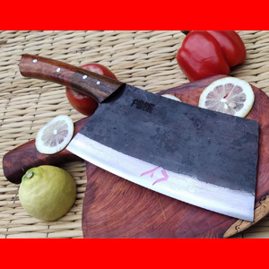 商品简介:此砍骨刀(斩骨刀)刀为精选进口车弹簧(非普通弹簧钢)户撒传统锻造工艺反复锻打而成,刃口局部淬火,以达到刚柔相济作用,刃口采用人工冷磨以防刃口退火!并且采用不同目数的磨石依次打磨,根据刀具不同的应用要求进行刃口处理,使用更加得心应手!刀柄采用上等缅甸红酸枝手工制作,手感舒适耐用!此款砍骨刀(斩骨刀)刃长19-20厘米 宽度10厘米左右(全手工锻打数据会稍有变化)左右,刀表面保持锻打痕迹体现煅烧黑效果,此刀符合大部分家庭用户使用习惯和需求,达到轻松砍大骨头不伤刃口,再实际测试性能时砍钢筋也不在话下,性能非常强悍!拥有了它们让您感觉家庭做饭也充满了阳刚之气!