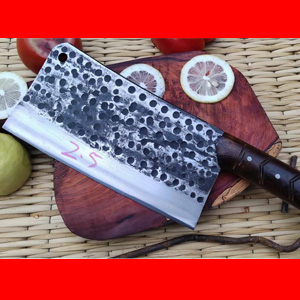 商品简介:此砍骨刀(斩骨刀)刀为精选进口车弹簧(非普通弹簧钢)户撒传统锻造工艺反复锻打而成,刃口局部淬火,以达到刚柔相济作用,刃口采用人工冷磨以防刃口退火!并且采用不同目数的磨石依次打磨,根据刀具不同的应用要求进行刃口处理,使用更加得心应手!刀柄采用上等缅甸红酸枝手工制作,手感舒适耐用!此款砍骨刀(斩骨刀)刃长22厘米左右 宽度10.5厘米左右(全手工锻打数据会稍有变化)左右,刀表面锻打蜂窝效果,此刀手感压手,分量十足,大厨砍骨刀必备,轻松砍超大骨头,再实际测试性能时砍钢筋也是轻松,性能非常强悍!拥有了它们让您感觉家庭做饭也充满了阳刚之气!