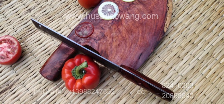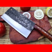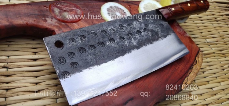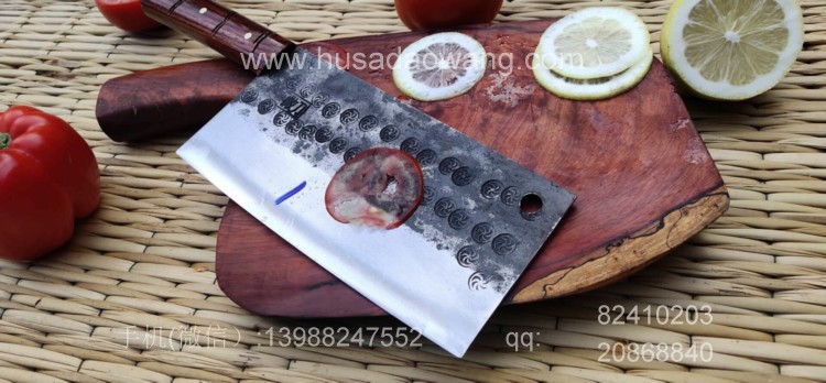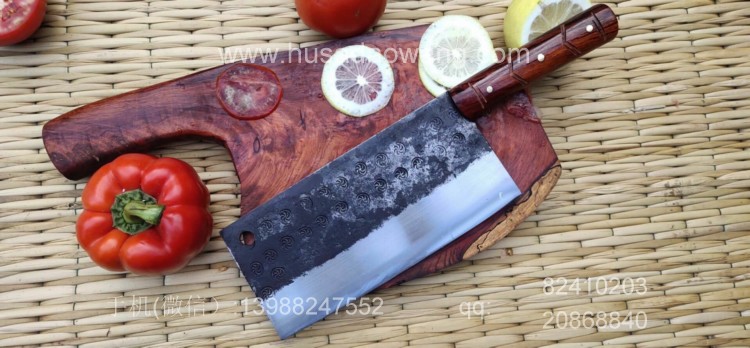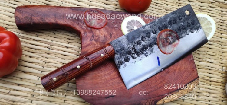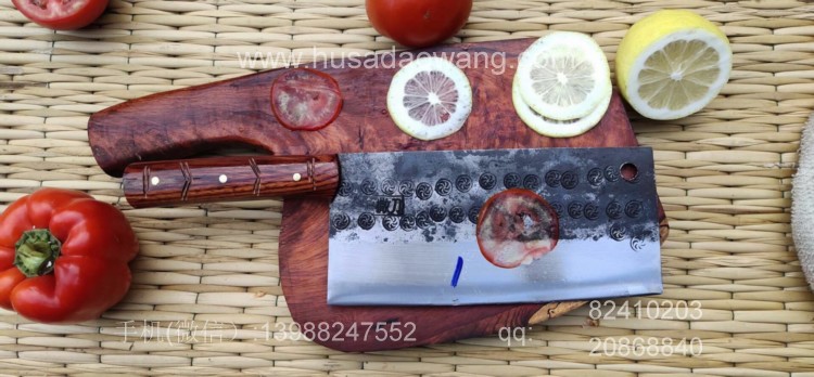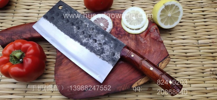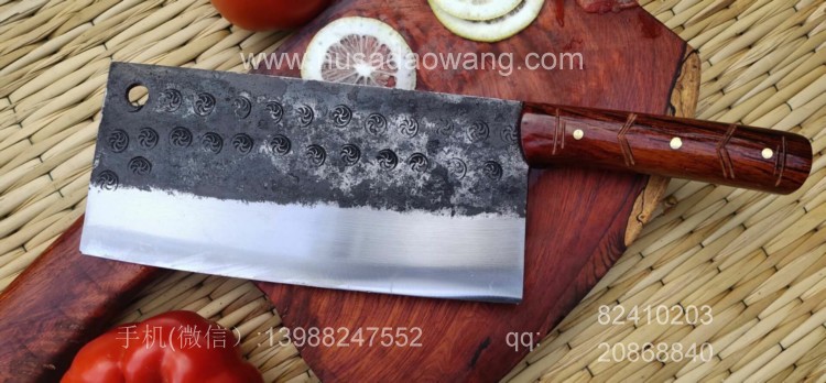 商品简介:此菜刀为精选进口车弹簧(非普通弹簧钢)户撒传统锻造工艺反复锻打而成,刃口局部淬火,以达到刚柔相济作用,刃口采用人工冷磨以防刃口退火!并且采用不同目数的磨石依次打磨,达到锋利刮毛的锋利度,使用更加得心应手!刀柄采用上等缅甸红酸枝手工制作,手感舒适耐用!此款菜刀刃长19-20厘米 宽度9厘米左右(全手工锻打数据会稍有变化)左右,菜刀极为锋利!达到可轻松剃毛过水瓶的锋利度,家庭切片非常好用!符合绝大多数家庭用刀习惯,得到当地及外省客户的一致好评!