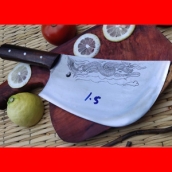 商品简介:此砍骨刀(斩骨刀)刀为精选进口车弹簧(非普通弹簧钢)户撒传统锻造工艺反复锻打而成,刃口局部淬火,以达到刚柔相济作用,刃口采用人工冷磨以防刃口退火!并且采用不同目数的磨石依次打磨,根据刀具不同的应用要求进行刃口处理,使用更加得心应手!刀柄采用上等缅甸红酸枝手工制作,手感舒适耐用!此款砍骨刀(斩骨刀)刃长20厘米左右 宽度10.5厘米左右(全手工锻打数据会稍有变化),刀体表面名匠手工雕刻龙凤等吉祥图案极具户撒阿昌族民族风,此刀符合大部分家庭用户使用习惯和需求,达到轻松砍大骨头不伤刃口,再实际测试性能时砍钢筋也不在话下,性能非常强悍!拥有了它们让您感觉家庭做饭也充满了阳刚之气!