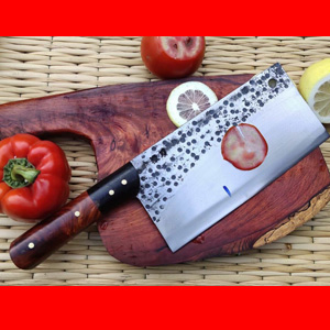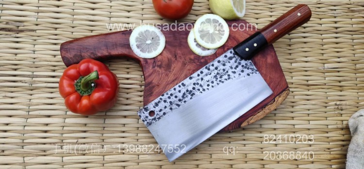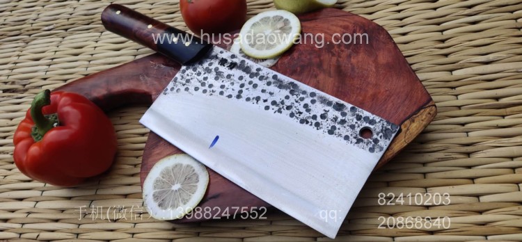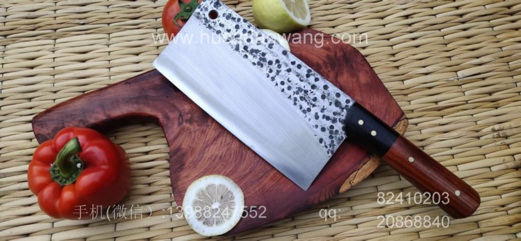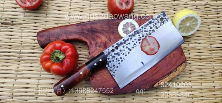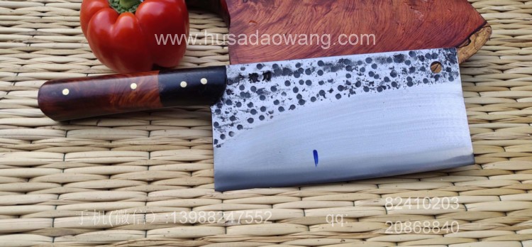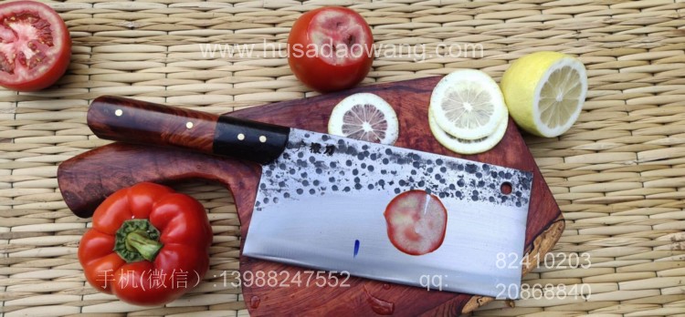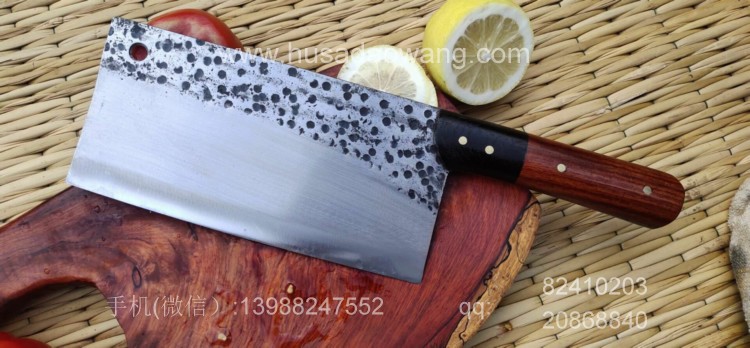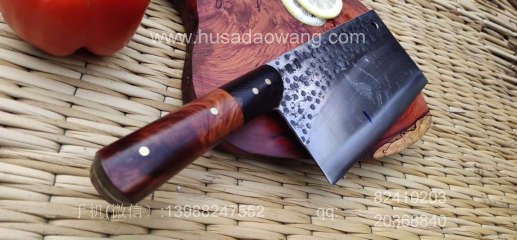 商品简介: 此菜刀为精选进口车弹簧(非普通弹簧钢)户撒传统锻造工艺反复锻打而成,刃口局部淬火,以达到刚柔相济作用,刃口采用人工冷磨以防刃口退火!并且采用不同目数的磨石依次打磨,达到锋利刮毛的锋利度,使用更加得心应手!刀柄采用上等缅甸红酸枝手工制作,手感舒适耐用!此款菜刀刃长19-20厘米 宽度9厘米左右(全手工锻打数据会稍有变化)左右,菜刀极为锋利!为大厨设计用刀,达到可轻松剃毛过水瓶的锋利度,大厨切片非常好用!并且也符合绝大多数家庭用刀习惯,成为一款销售火爆的爆款菜刀!