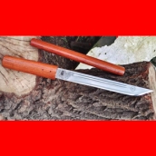 商品简介:此款为户撒刀名匠线乔发手工锻打的一把精品小棍刀,采用优质弹簧钢全手工锻打制作,乔发祖传配方淬火,刀条刚柔相济,锋利刮毛!刀柄刀鞘采用优质红酸枝手工制作,制作构思精巧,刀鞘刀柄的结合采用了木质销钉,做好后销钉与刀鞘木材融为一体,刀入鞘后外观就像一根人畜无伤的棍子,更增加了此刀的隐蔽和观赏性!