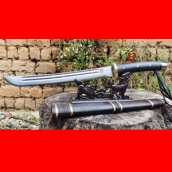 商品简介:此刀由户撒刀省级非物质文化传人杨茂方亲手打制,为经典的背厚刃薄大威力短马刀,刀身开两道血槽,起到调整配重和加固刀身强度的作用,也更显得峥嵘霸气!此刀刀型美观流畅,刀条经过匠人千锤百炼后配方淬火而成,钢火一流,并且刚柔相济,砍断铁丝就如同砍韭菜一般,一体全龙骨打造坚固耐用,尾端手工加钢,增加了户外锤击作用,刀鞘刀柄为优质黑檀木手工制作,外部加综丝和铜圈固定,宝刀入鞘严丝合缝,收藏把玩户外极好的选择!